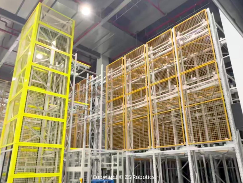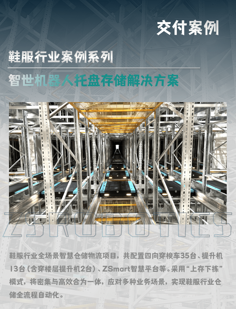 智世机器人针对项目需求以及鞋服行业应用痛点,共配置35台四向穿梭车、13台高精度提升机(含2台穿楼层提升机)、ZSmart智慧平台等其他相关配套设施。采用四向穿梭车与AGV联动“上存下拣”模式,同时满足密集存储高效吞吐,切实解决客户痛点实现高存储高吞吐的存拣一体化。