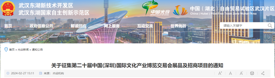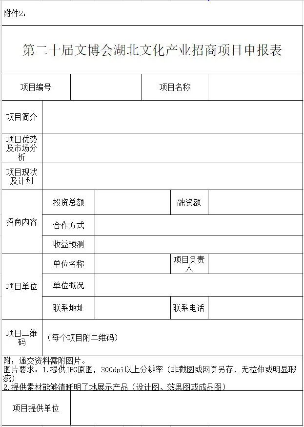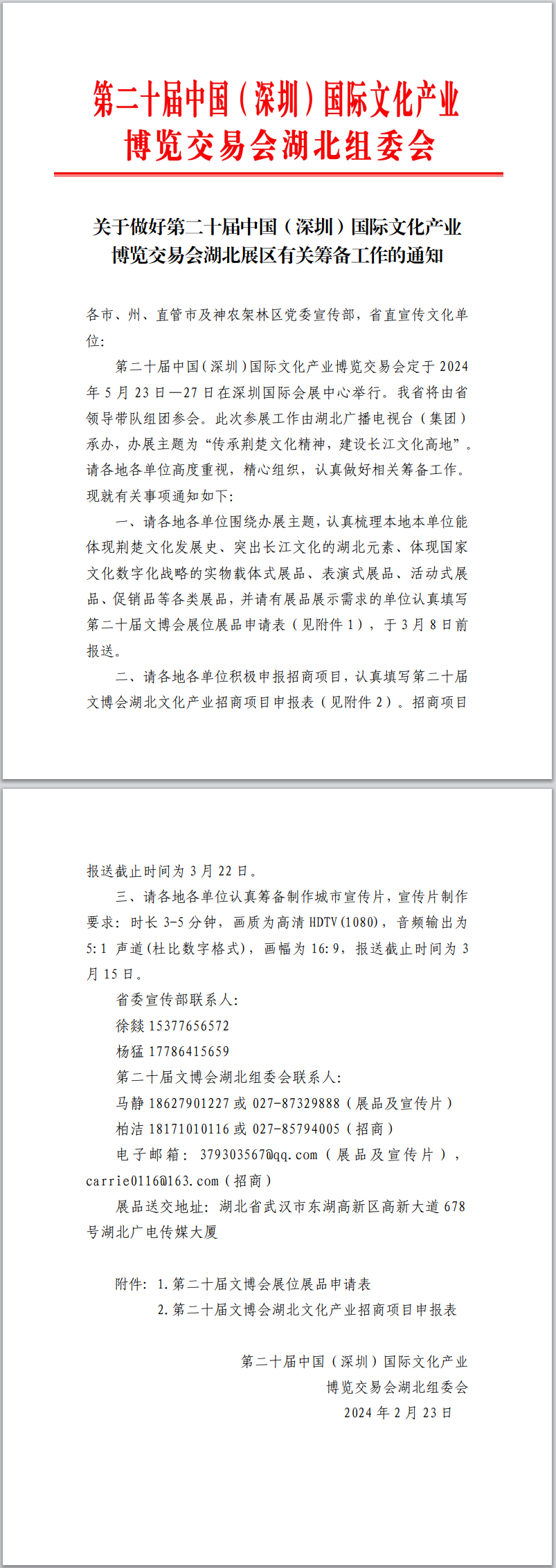 第二十届中国(深圳)国际文化产业博览交易会拟于2024年5月23日—27日在深圳国际会展中心举办。届时我省将以“传承荆楚文化精神,建设长江文化高地”主题参展,请有展品展示项目需求及招商项目宣传推介的单位,于3月7日(下周四)将第二十届中国(深圳)国际文化产业博览交易会展位展品申请表、文化产业招商项目申报表发至邮箱:295824633@qq.com。
