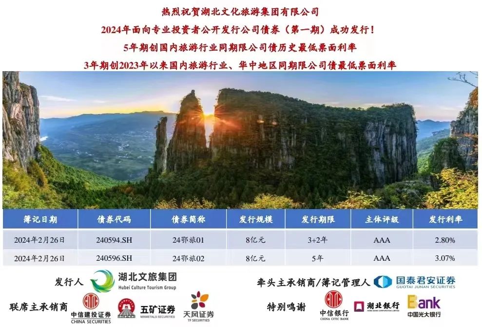 2月26日,湖北文化旅游集团有限公司2024年面向专业投资者公开发行公司债券(第一期)成功发行,由国泰君安证券、中信建投证券、五矿证券、天风证券联合承销,发行规模16亿元,3+2年期品种金额8亿元、票面利率2.80%,5年期品种金额8亿元、票面利率3.07%。双品种均刷新集团同期限债券票面利率最低记录,同时,3+2年期品种创2023年以来国内旅游行业、华中地区同期限公司债最低票面利率,5年期品种创国内旅游行业同期限公司债历史最低票面利率。
