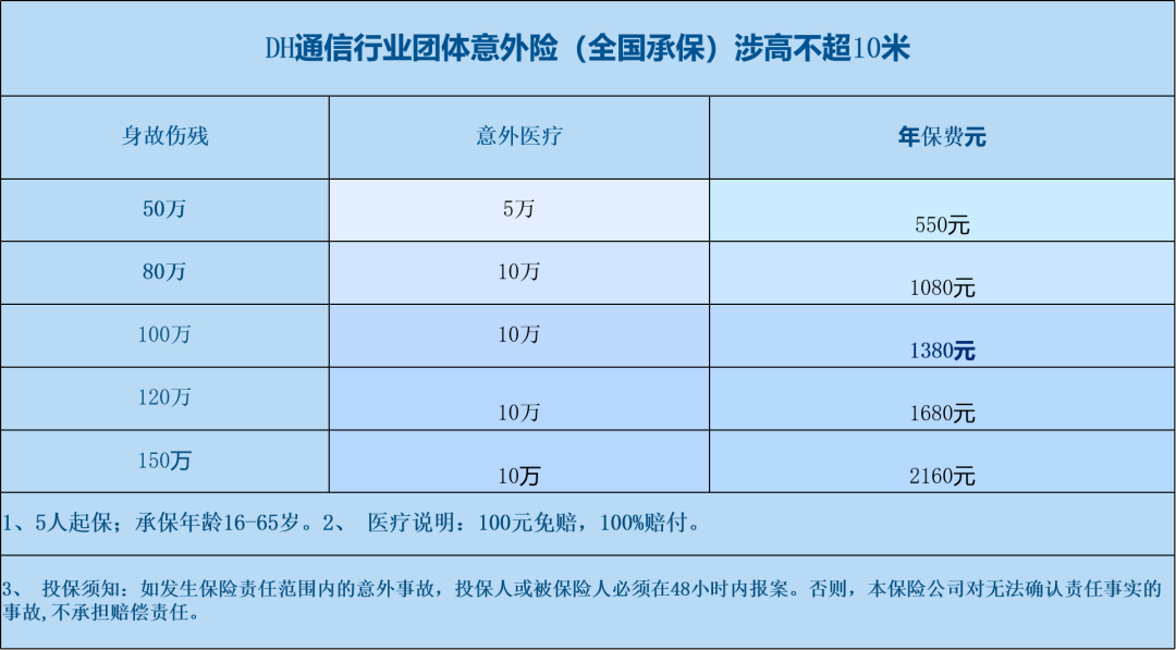 鼎和保险通信行业团体意外险;保额50万150万,承保年龄;18-65岁,涉高不能超10米,承保区域;全国。