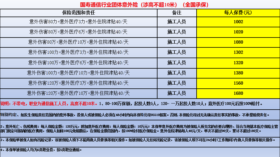 中国人寿通信行业团体意外险;保额80万120万,承保年龄;18-65岁,涉高不能超10米,承保区域;全国,个别地区需要人工核保。