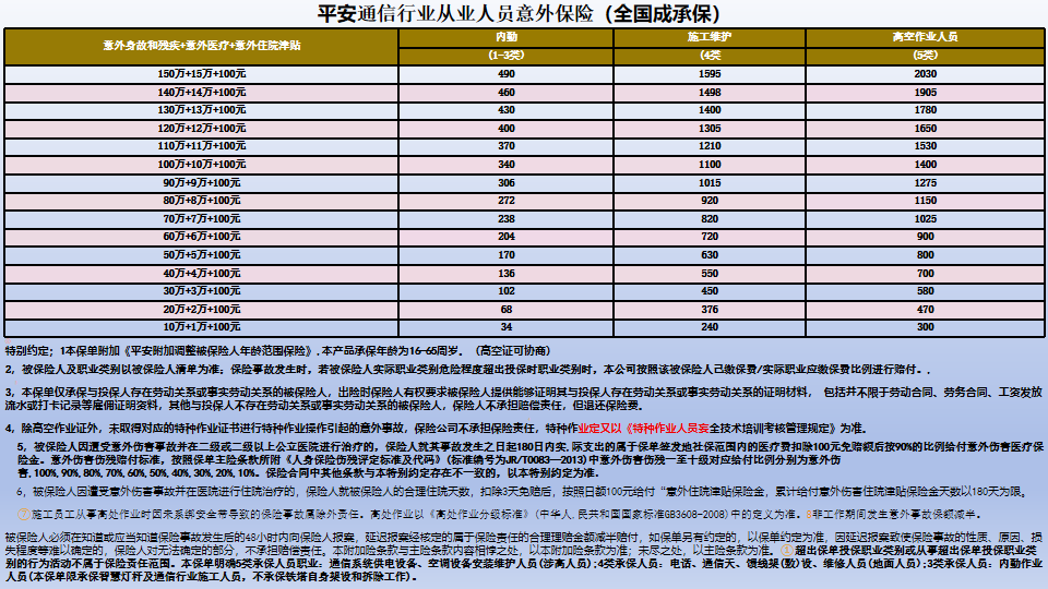 中国平安通信行业团体意外险;保额10万150万,承保年龄;18-65岁,高空证可协商,承保区域;全国无限制。