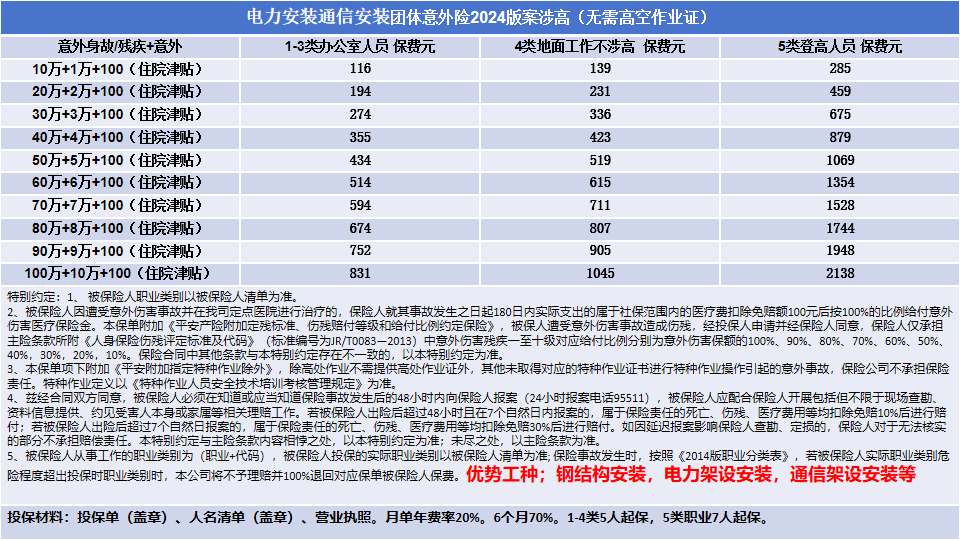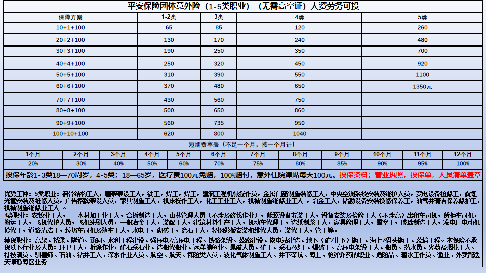 产品优势:1-5类涉高无区域限制,被保人年龄可保至16-70岁 ,1-12个月灵活投保,1-4类职业最高可保100万,投保年龄扩宽至最高70岁 ,建筑劳务公司及人资公司可正常投保,涉高作业无需高空作业证,死亡伤残无需提供安监证明。