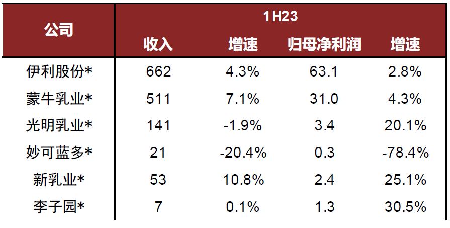 图表:1H23乳制品板块公司收入和业绩(亿元)