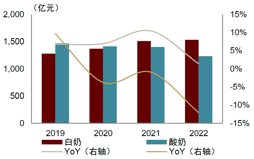 图表:2019-2022年白奶&酸奶零售额及同比增速