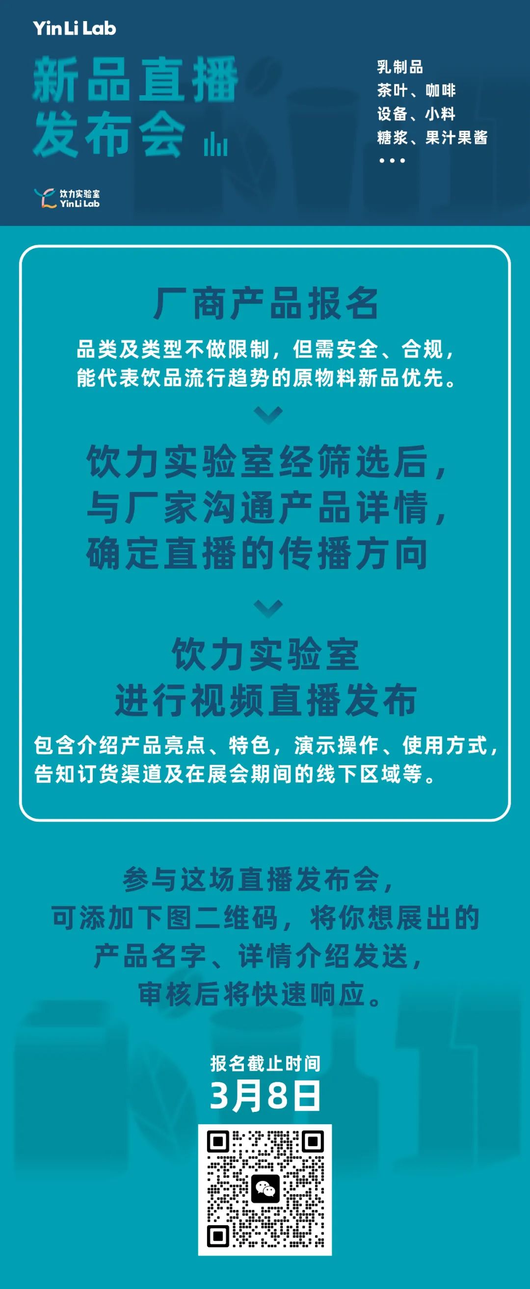 新品直播发布会饮品业在源源不断推出新奇特产品:0氢化的乳制品,龙井碧螺春等春天的茶,全自动化的奶茶机,获金奖的咖啡豆等等……让新品被更多品牌看到,被更多消费者喝到,被厂商卖得更好,这个春天,饮力实验室将启用新渠道,将持续不断的创新力,落地为实用价值:采用线上直播的形式,挑选有亮点、有特色、有价值的原物料新品,更直观灵活地进行产品介绍、操作方式演示,进行一波大力宣传。这样的直播方式,既能通过讲述+演示的形式,让原料新品被全面了解,起到宣传的作用;也是在3月上海展会前,对产品的提前预热,让更多用户锁定线下见面。此次活动,主要针对饮品原物料厂家,全程免费,核心只有一个:让好的新原料,获得一个快速被深度认识的机会。想宣传新产品或为3月上海展做预热的饮品原物料厂商。饮力实验室聚合饮品研发,聚焦茶饮、咖啡供应链,助力产业效率提升。2022年上线以来,已开通公众号、小程序、小红书等多个渠道,全网粉丝6W+。 饮力实验室新品测评栏目,对供应链端推出的新原料、好原料,站在门店需求的角度进行测试,发掘其最大亮点和特色,供品牌参考。截止目前,已完成饮品原物料新品测评60款,涉及原料类型包括乳制品、茶叶、咖啡豆、糖浆、抹茶、樱花酱、酸奶、冰淇淋、咖啡机、果汁、花水、竹叶粉、咖啡豆、奶泡粉、黑糖粉、米乳、椰乳等等多种类。