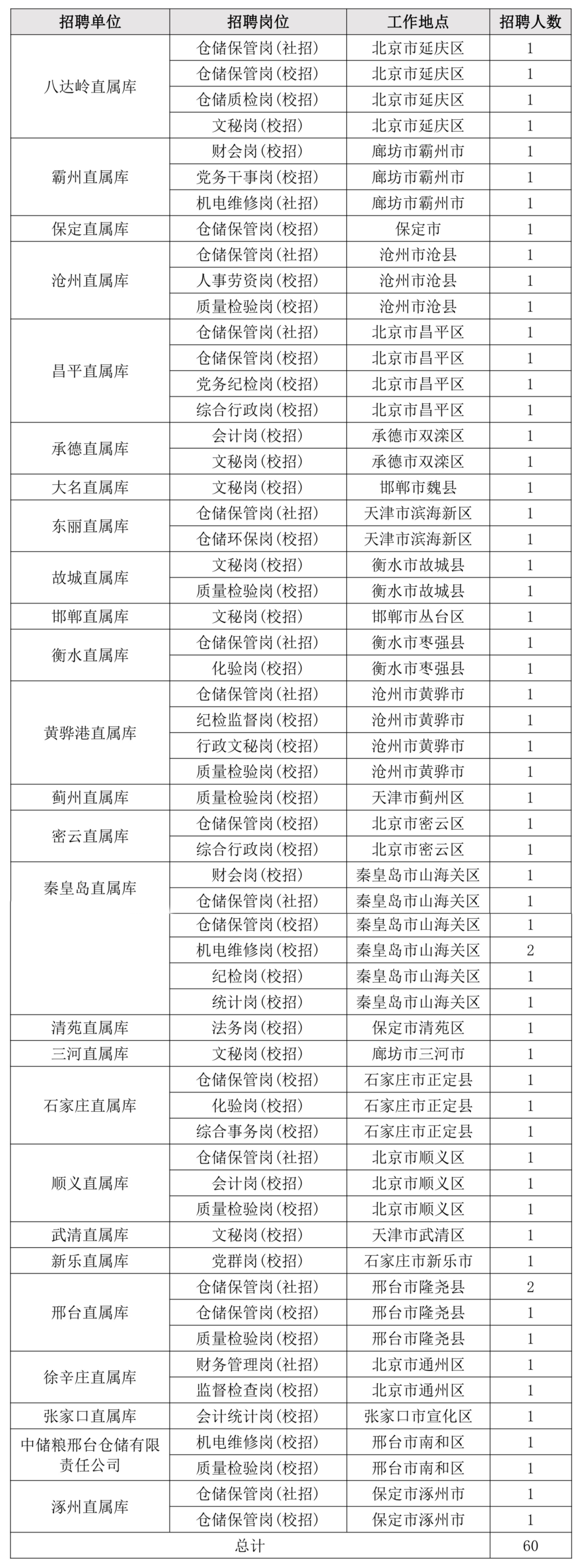 计划通过公开招聘的方式招聘60人,其中校园招聘计划招聘47人,社会招聘计划招聘13人。招聘单位、职位、工作地区及招聘人数等情况见下表,岗位职责等信息可通过报名系统查看。
