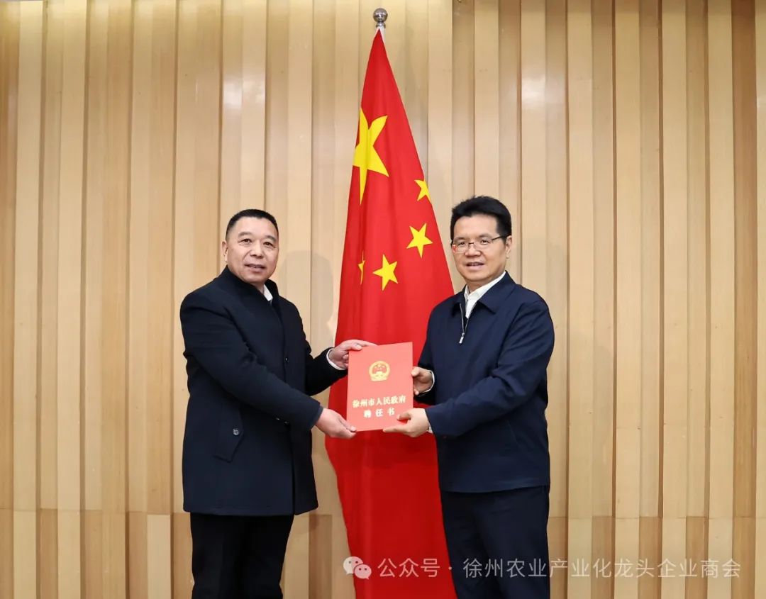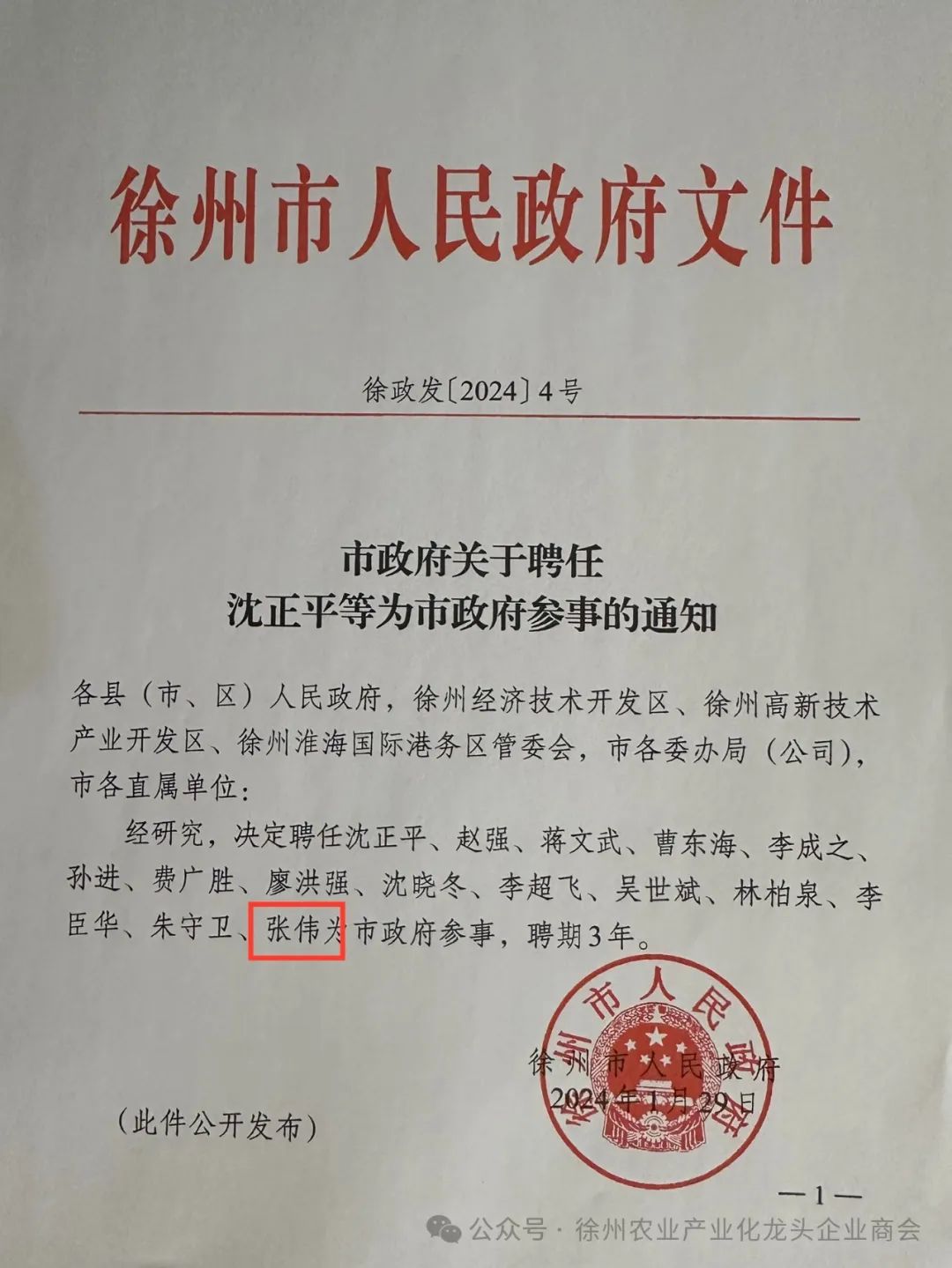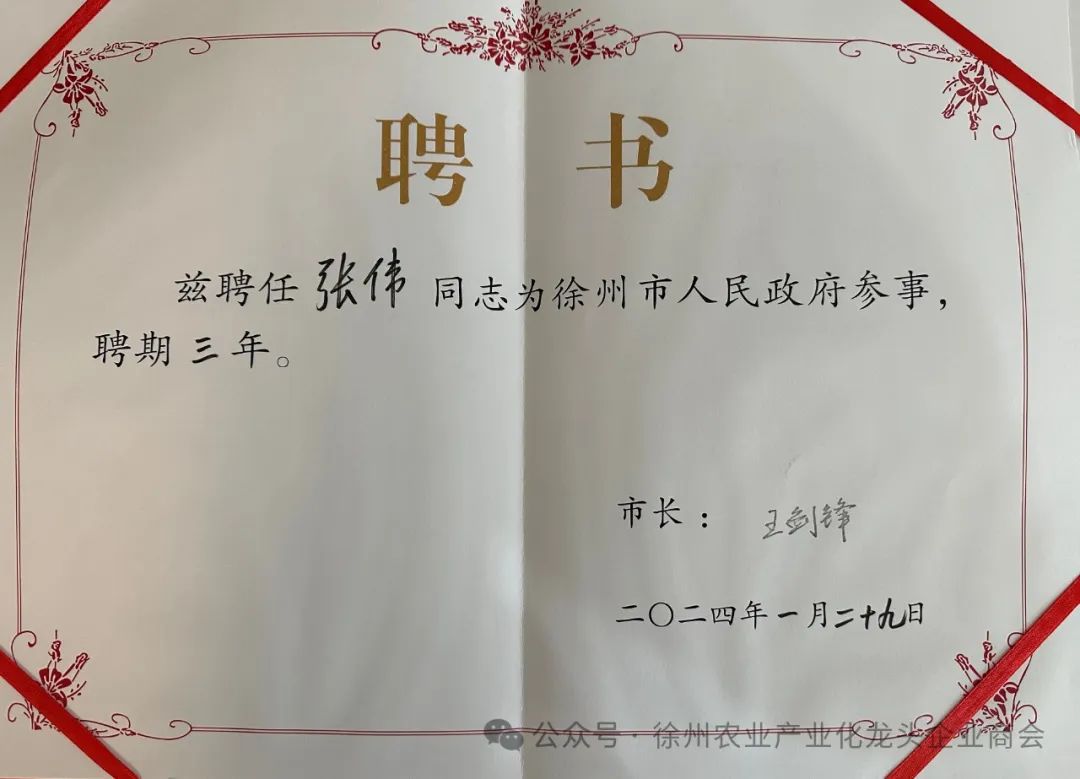 2024年2月27日下午,徐州市政府内举行了一场庄重而热烈的聘任仪式。徐州市市长王剑锋亲自为徐州市农业产业化龙头企业商会会长张伟颁发了徐州市政府参事聘书,本次聘任标志着张伟先生正式成为徐州市政府决策层的重要一员。