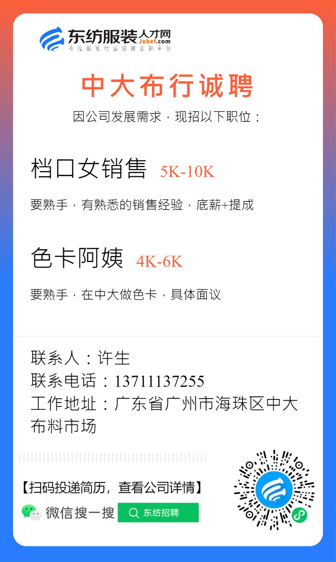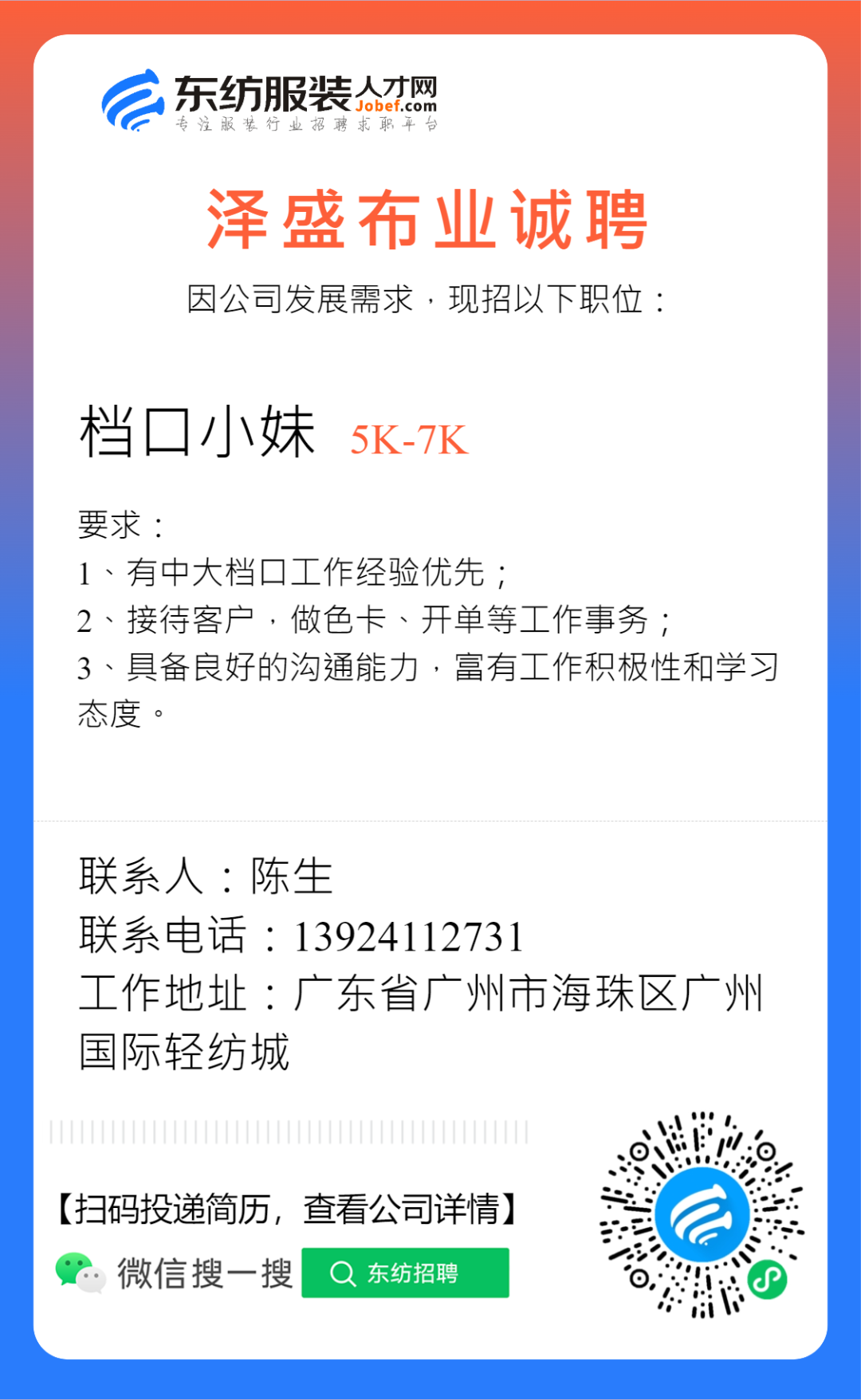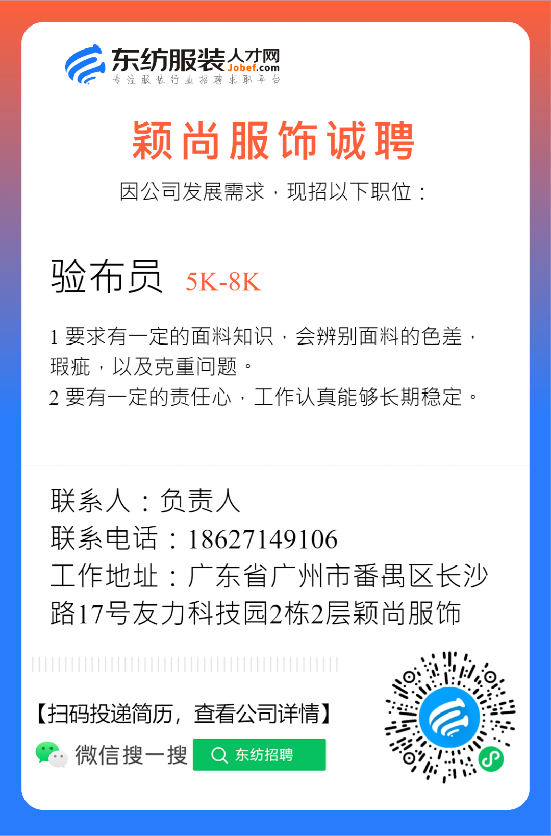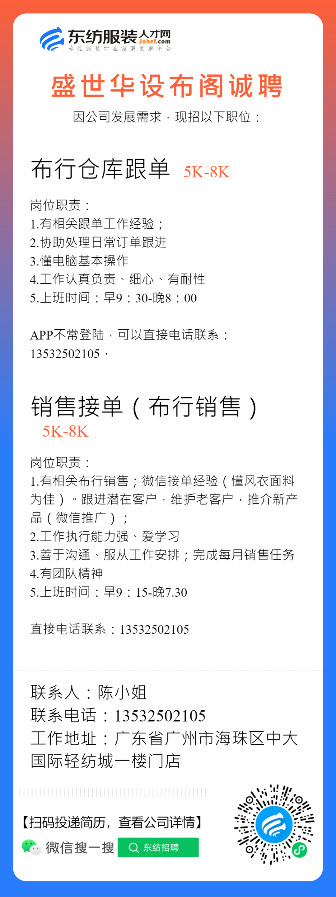 服装招聘·布行类丨2. 28号,验布员、布行销售、质检员……