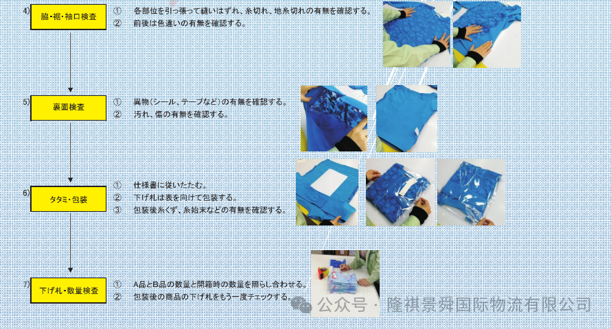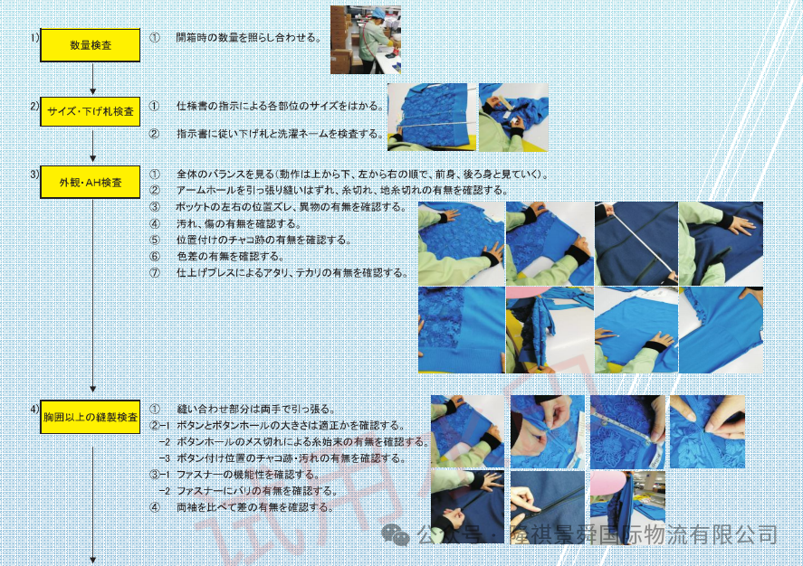 关于检查产品的尺寸、面料、缝制、后整、附属品等及检针(X线检查)。
