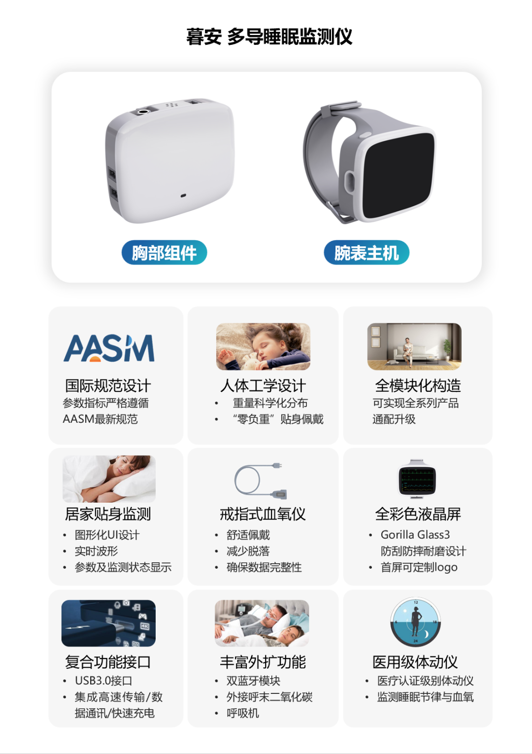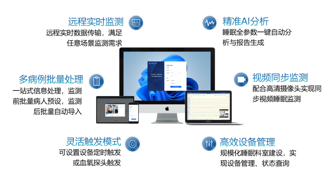 全参数临床多导睡眠监测仪,高精度集成化设计,科学化人体工学方案,“零负重”贴身穿戴,胸前重量<45g。具备全彩色液晶屏、高清视频监控和丰富外扩功能接口,满足多样场景下的整夜睡眠监测需求。配套AI软件可实现全参数一键分析与报告生成,分析参数严格遵循最新AASM标准定制。