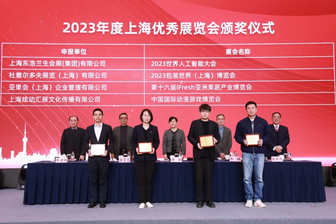 本次评优活动共评选出20个展览会授予“2023年度上海品牌展览会”称号, 55个展览会授予“2023年度上海优秀展览会”称号,并在本次颁奖典礼上进行荣誉表彰。