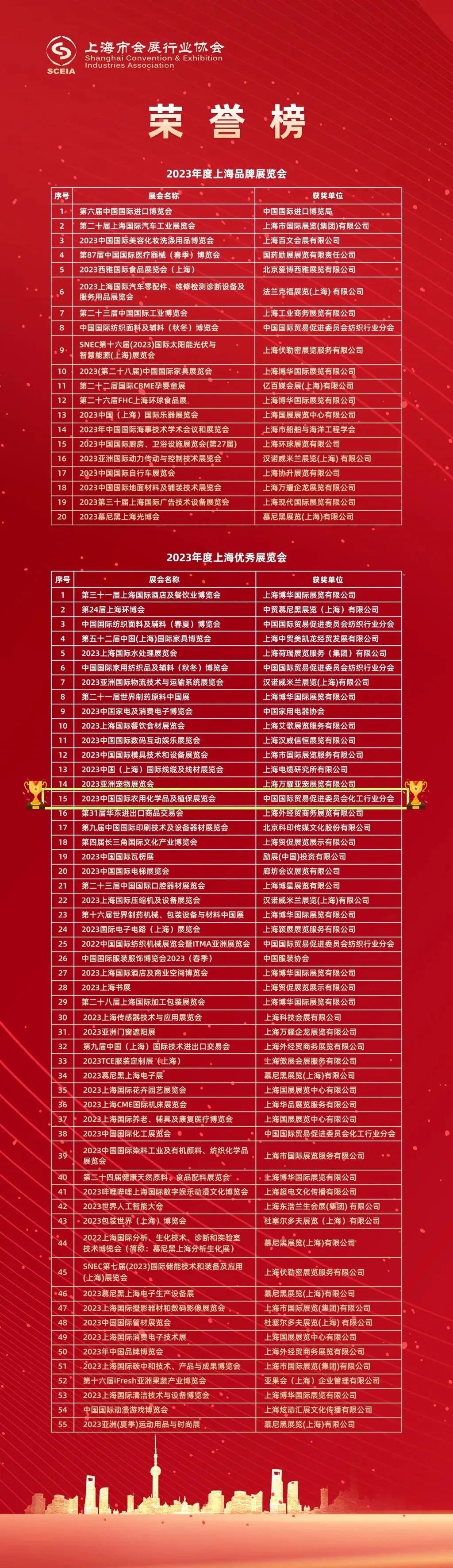 本次评优活动共评选出20个展览会授予“2023年度上海品牌展览会”称号, 55个展览会授予“2023年度上海优秀展览会”称号,并在本次颁奖典礼上进行荣誉表彰。