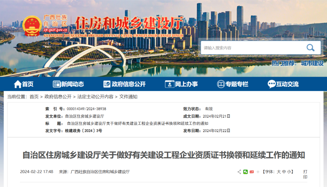 三、自2024年2月29日起,企业(建筑业、勘察设计、监理企业)可提交换证申请。企业登陆广西建设网(网址:http://www.gxcic.net/wsbs/)“桂建云”平台“行政审批系统”进行申报信息填写,按要求提交相关材料,点击提交即可完成申报。企业申报时资质需为“有效”状态,企业提交换证申请后自动换发证书,资质证书有效期届满前未申请换领相应资质证书的,逾期自动作废。