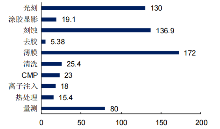 按设备种类分,前道工艺设备销售额为612亿美元,约占全部设备市场份额的86.1%;测试设备销售额60.1亿美元,约占全部设备市场份额的8.5%;封装设备38.5亿美元,约占全部设备市场份额的5.4%。主要工艺设备涉及的市场份额如下: