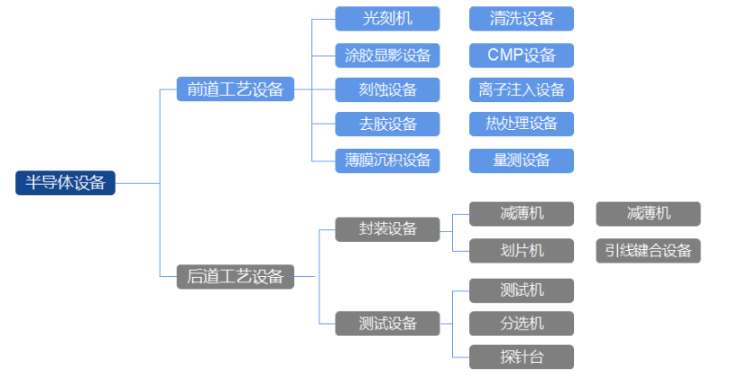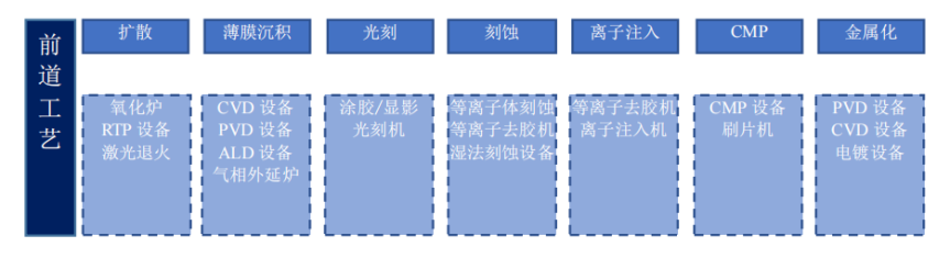 半导体设备主要指芯片制造专用设备。先进制程芯片的制造过程工序数以千计,而每一道工艺步骤均需使用不同的专用设备。工艺中使用的主要设备如下: