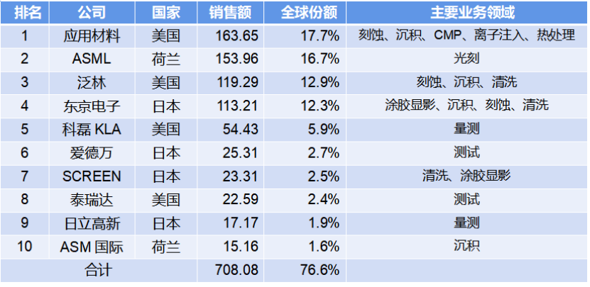 全球范围内的半导体设备龙头企业以美国、日本和欧洲公司为主,呈现出寡头垄断格局。半导体专用设备行业的国际巨头企业的市场占有率很高,特别是在光刻机、检测设备、离子注入设备等方面处于垄断地位,且其在大部分技术领域已采取了知识产权保护措施。全球前十大半导体设备厂商及2020年销售额(单位:亿美元)如下: