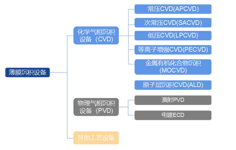 薄膜沉积是指在硅片等衬底上沉积待处理的薄膜材料,所沉积薄膜材料主要是二氧化硅、氮化硅、多晶硅等非金属以及铜等金属,沉积膜可为无定形、多晶的或者单晶。薄膜沉积设备主要负责各工艺步骤中的介质层与金属层的沉积,包括CVD(化学气相沉积)、PVD(物理气相沉积)和ALD(原子层沉积)等,其中ALD属于CVD的分支。按照沉积工艺不同,薄膜沉积设备分为CVD设备、PVD设备和ALD设备。