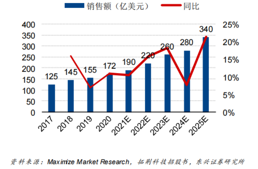 随着半导体行业整体景气度的提升,全球半导体设备市场呈现快速增长态势,依托庞大的终端应用市场需求,中国大陆半导体产业的规模持续快速增长,其中集成电路产业的发展尤为迅速,必将带动作为核心设备额薄膜沉积设备需求的增加。根据Maximize Market Research预计,全球半导体薄膜沉积设备市场规模在2025年将从2020年的172亿美元扩大至340亿美元,保持年复合13.3%的增长速度。