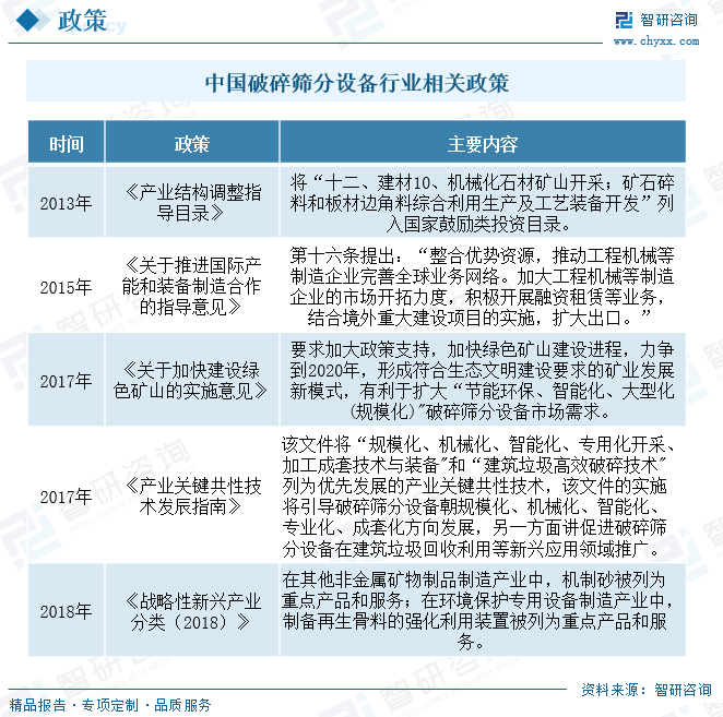 近年来随着我国经济的腾飞和制造业的快速发展,对原材料的需求持续增长,这使得对破碎筛分设备的性能和质量要求越来越高。对此政府也出台了一系列相关政策,旨在提高行业整体规范要求,鼓励行业快速发展,促使行业快速实现国产化、智能化、规模化。