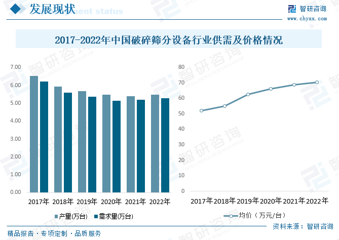 国内巨大的矿产资源储量和数量庞大的低品位矿的开发需要通过大量先进的破碎筛分设备来提高选矿厂的洗选效率,这将对破碎筛分设备在矿业行业的应用发挥良好的拉动作用,其市场需求将随着金属储备资源的开采利用而逐步体现;近年来随着建筑垃圾资源化利用等环保行业逐步兴起,破碎筛分设备环保应用市场空间巨大。2022年中国破碎筛分设备产量为5.49万台,需求量为5.27万台。随着下游砂石骨料行业的转型升级,具有定制化、成套化、规模化、节能环保等优势的破碎筛分成套设备(生产线)的市场需求将快速增长,市场均价呈上升态势,2022年中国破碎筛分设备市场均价为70.5万元每台。