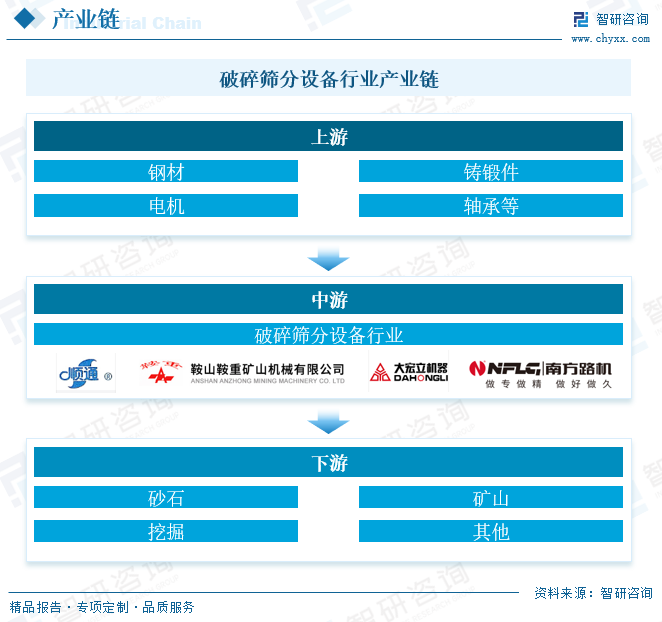破碎筛分设备行业上游包括基础冶金及控制设备供应商。涵盖钢材和以钢材为主要原材料的铸锻件、轴承等,以及电机、控制柜等设备。上游行业稳定的供求局面为破碎筛分设备行业的生产经营提供了保障。破碎筛分设备行业的下游主要为砂石、矿山和环保等领域。近年来,随着我国工业化、城镇化建设的不断推进,砂石骨料作为混凝土及砂浆的基础材料,在建筑、交通、水利等基础设施建设中被大量使用,为破碎筛分设备行业的快速发展创造了有利条件。破碎筛分设备下游行业因破碎筛分物料特点的不同,对设备也提出了不同的要求。