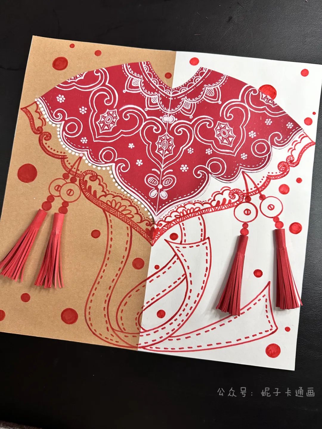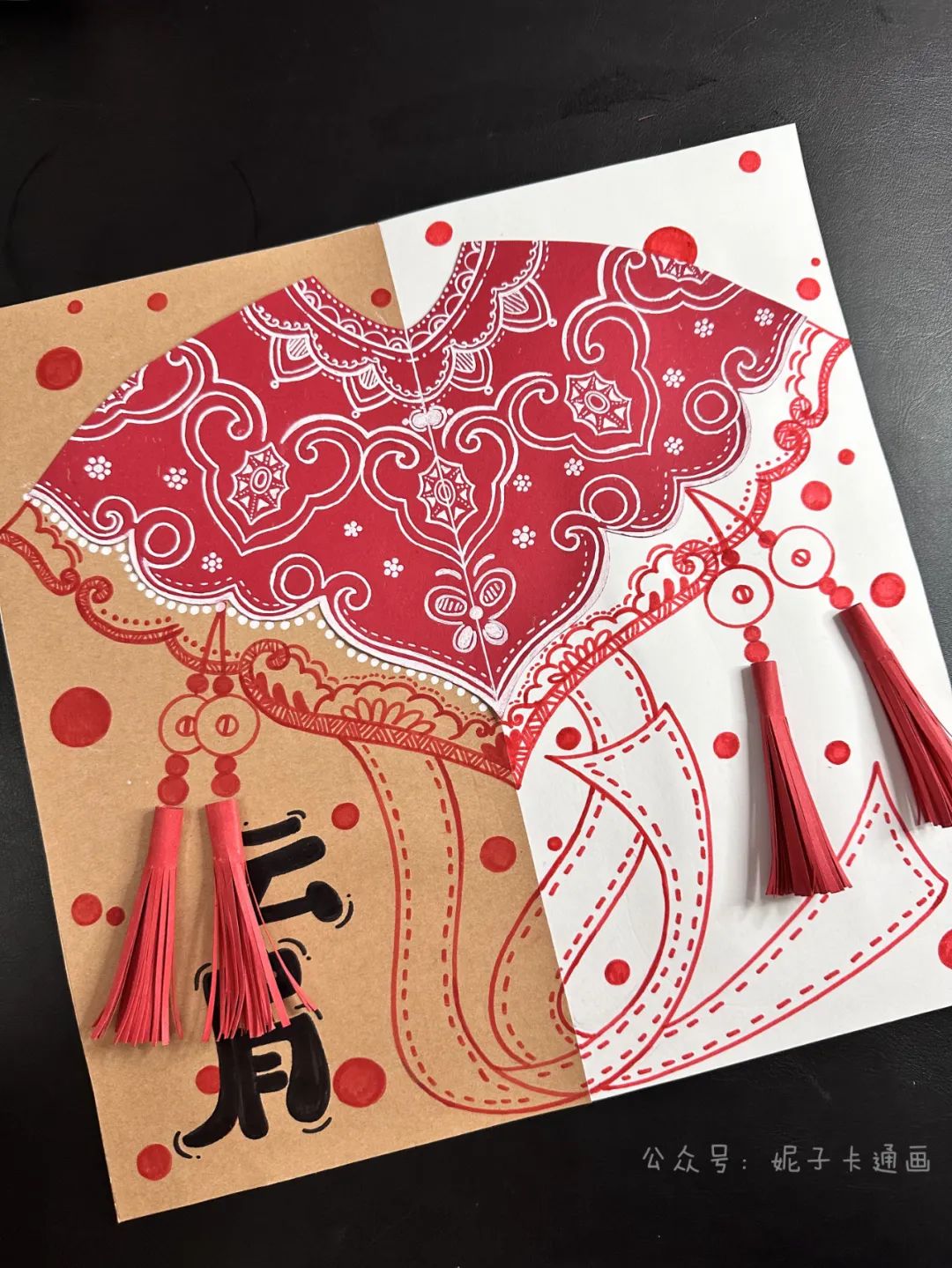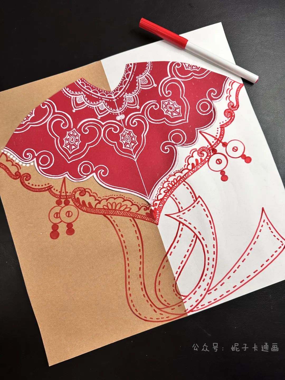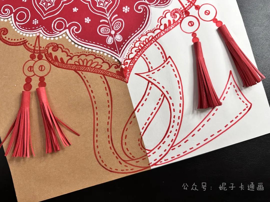 洒金红卡纸,白卡纸,牛皮纸,黑色笔,白色高光笔,剪刀,固体胶,彩色细头笔