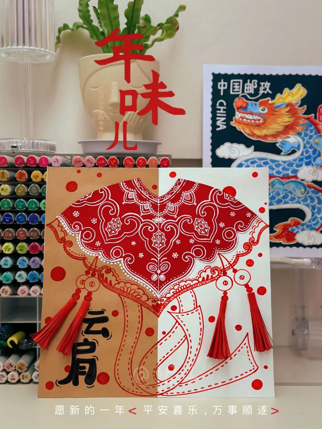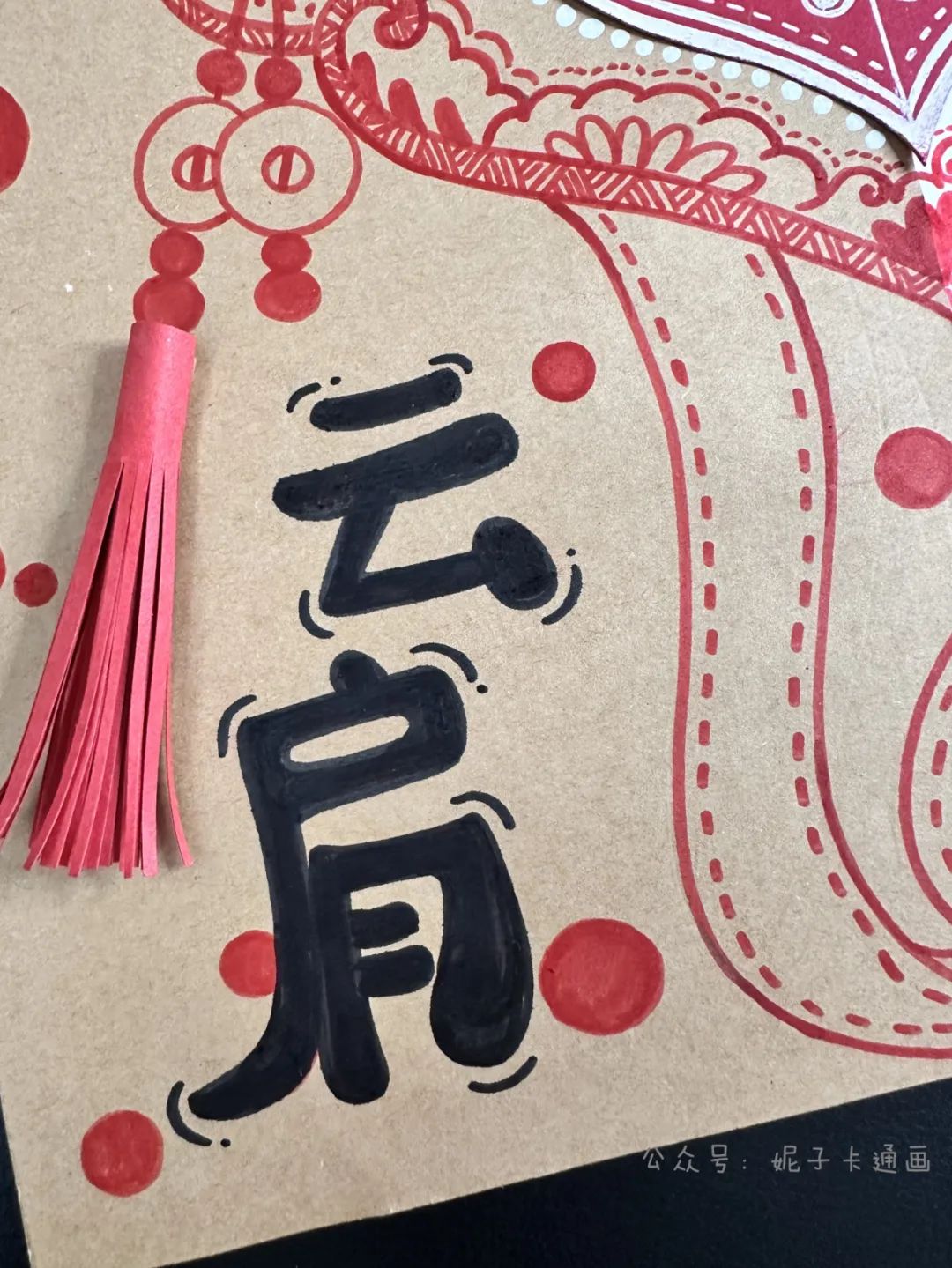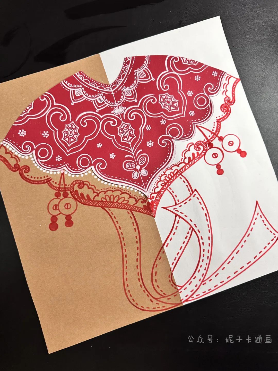 洒金红卡纸,白卡纸,牛皮纸,黑色笔,白色高光笔,剪刀,固体胶,彩色细头笔