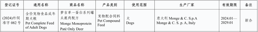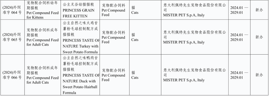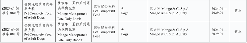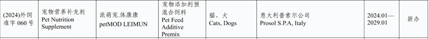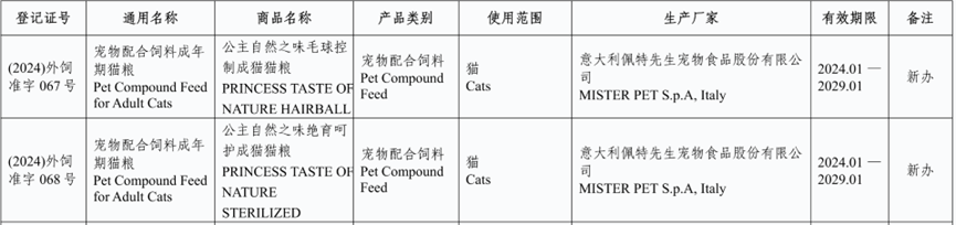 我们看一下意大利新获批登记明确用于宠物进口饲料和饲料添加产品(有效期2024.01-2029.01)