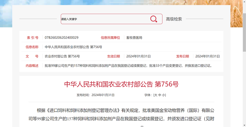 近日农业农村部发布了第756号公告,公告显示批准99家公司生产的157种饲料和饲料添加剂产品在我国登记或续展登记,批准33个产品变更登记,并换发进口登记证。