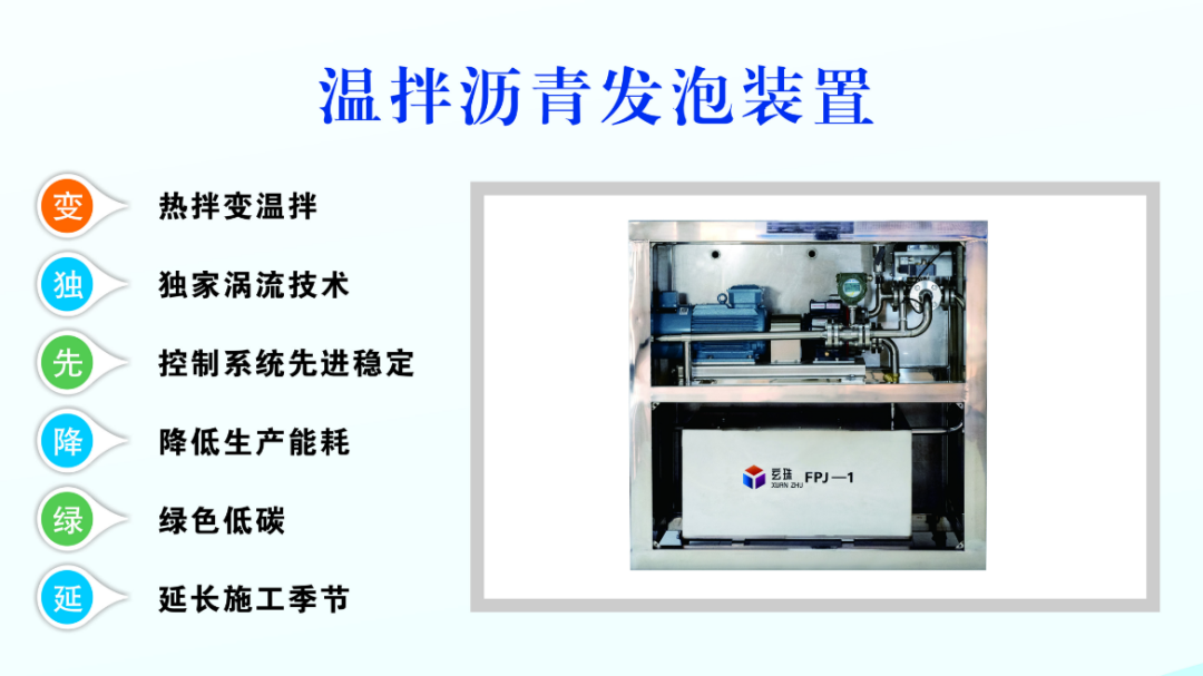 温拌沥青发泡装置,采用机械发泡,通过独特的涡流技术,提高了沥青发泡的效果,在沥青拌和站上加装即可,能方便地进行温拌泡沫沥青混合料和热拌沥青混合料的生产转换,推进交通工程、市政建设行业绿色低碳发展。