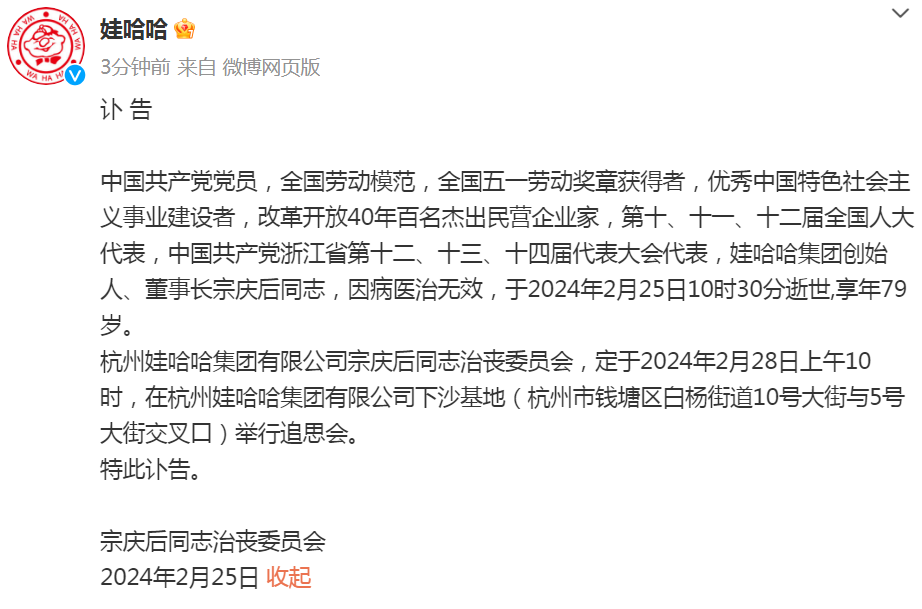 2月25日,娃哈哈集团发布讣告: