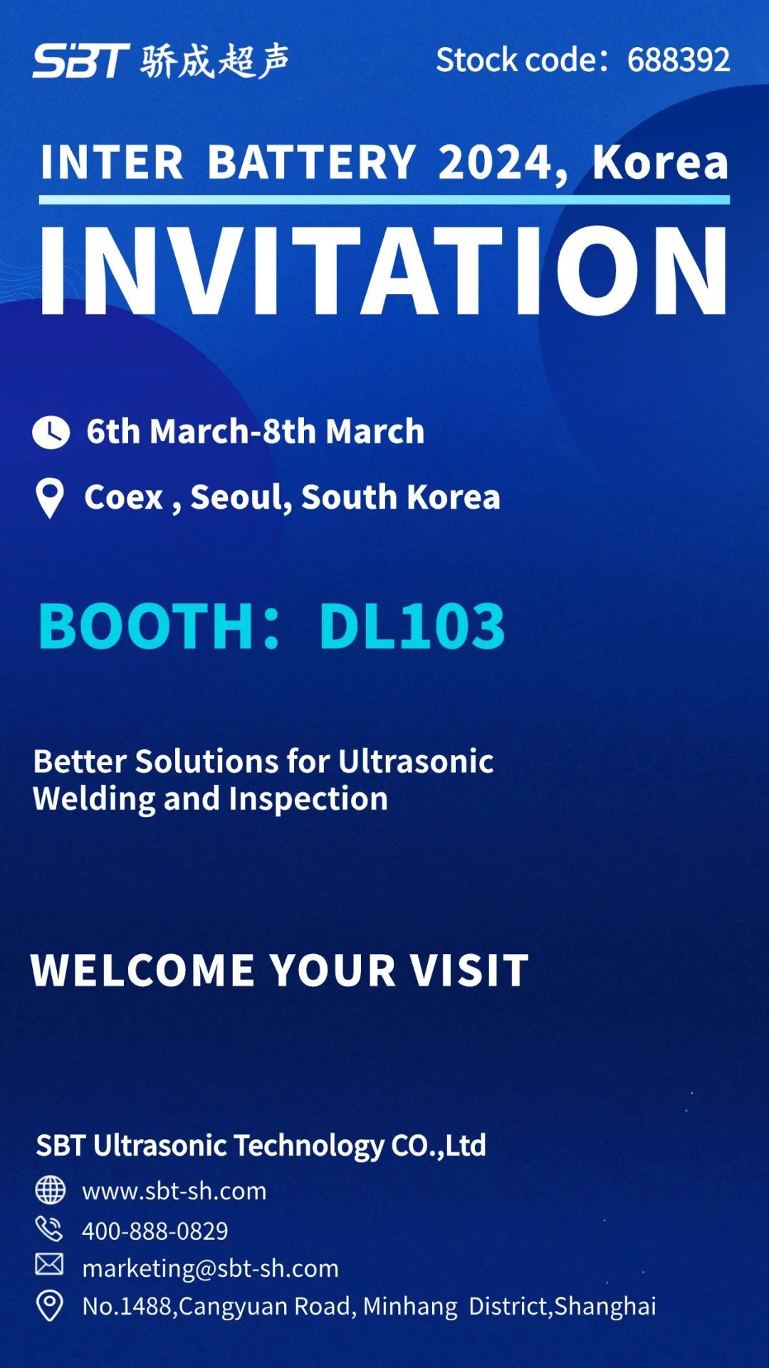 The debut appearance of SBT Ultrasonic at Inter Battery 2024 will feature a range of ultrasonic application solutions for new energy batteries, including a lithium battery tabs ultrasonic welding machine, an ultrasonic metal welding online monitor, a laser welding online monitor, and an ultrasonic dust removal system. Our aim is to discuss emerging trends in the industry with global customers and peers, while exploring new opportunities for collaboration.