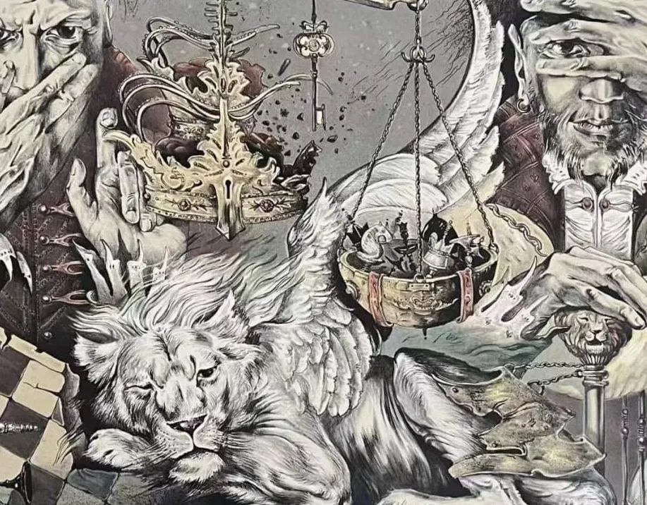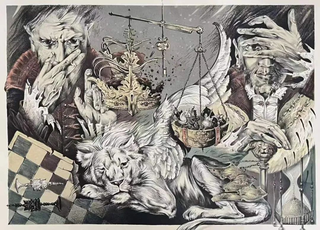 在大连文博艺术馆的《鉴臻》展览中,一幅来自乌克兰艺术家乌里扬娜·图尔琴科的石版画吸引了众多观者的目光。这幅作品属于她的国际象棋系列,名为《国王》。