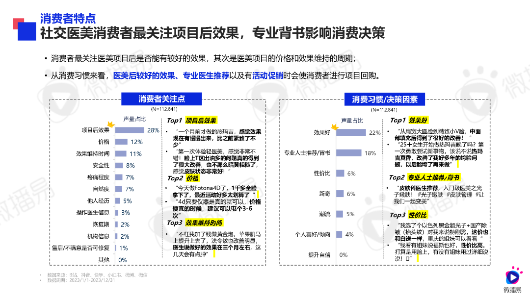 消费者选择医美项目的主要原因集中在医美效果呈现、价格以及效果维持时间上。专业人士的推荐也对消费者的决策产生重大影响。面部美学项目备受关注,而这些项目的组合应用更能提升效果,深受消费者欢迎。