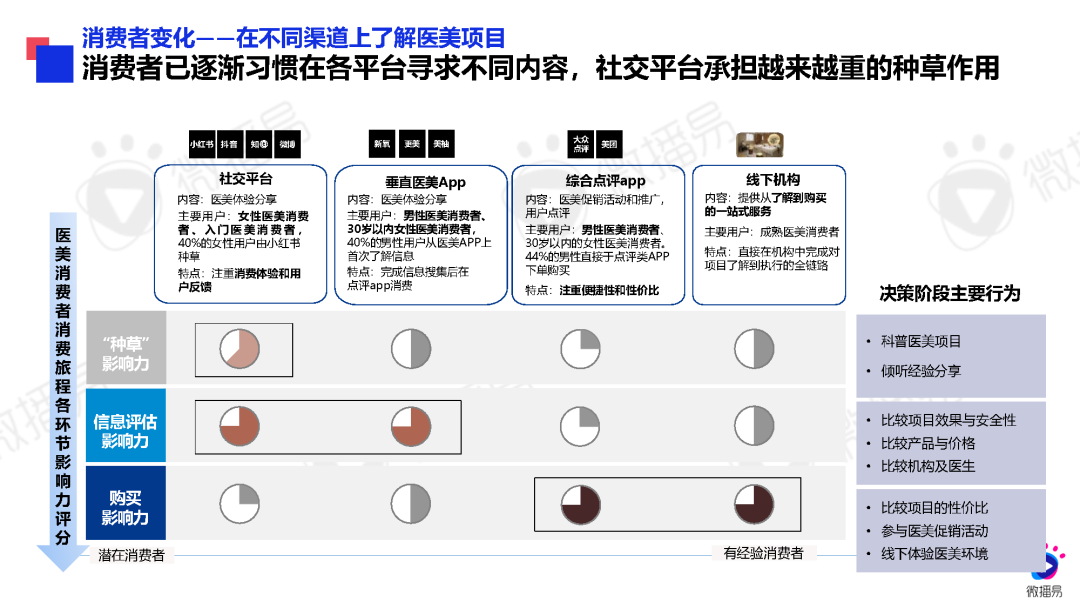 社交平台在医美消费者间扮演着关键角色,不同平台在消费者决策阶段中发挥着不同的作用,引导消费者从兴趣转化为信任。通过种草和信息筛选,成为消费者前置种草的重要环节,促进了医美消费市场的发展。