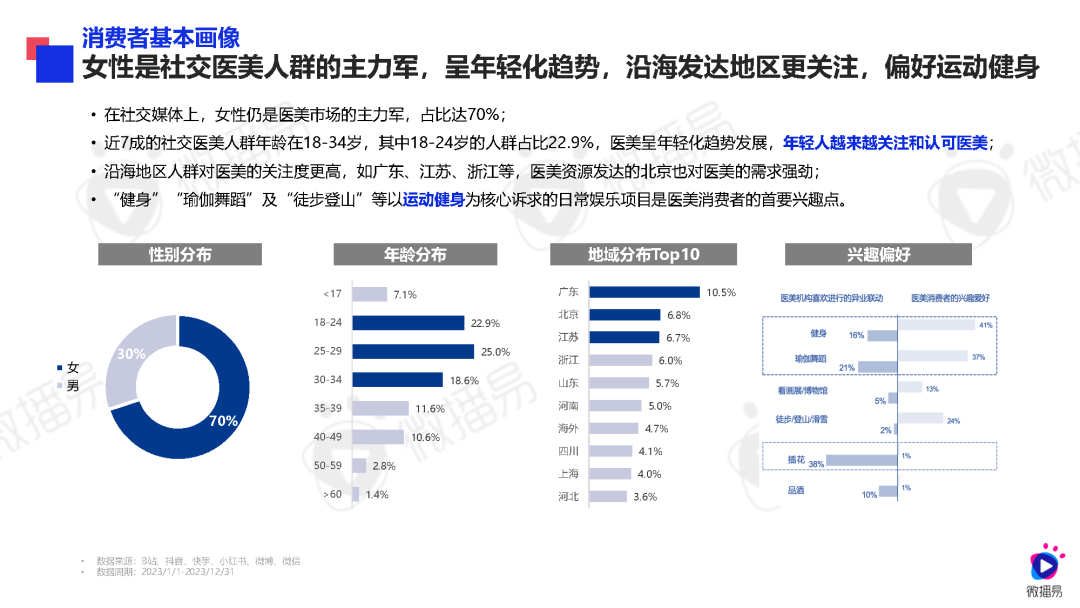 报告显示,医美市场的主力军主要是女性,其中18至34岁的年轻人成为主流客群,对医美项目表现出日益浓厚的兴趣和认可。尤其在广州、江苏浙江等地区以及北京等医美资源发达地区,医美需求更为强劲,呈现出明显的消费新趋势。