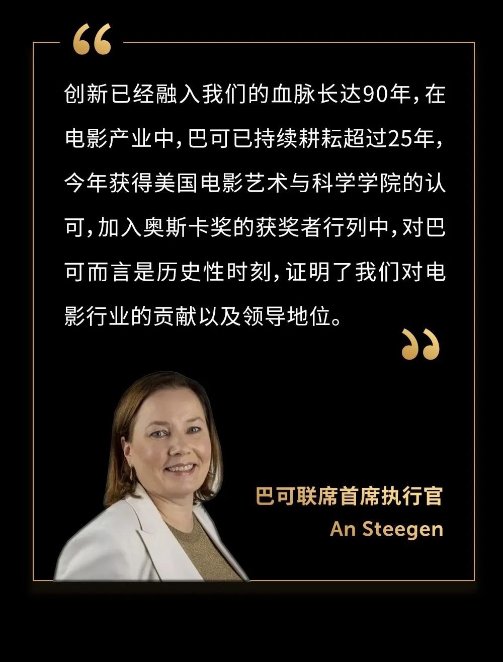 巴可研发副总裁Wouter D’Oosterlinck、研发总监Goran Stojmenovik和高级光学设计专家Peter Janssens荣获“奥斯卡科学与工程奖”。同时,凭借对杜比影院系统开发的贡献,巴可影院执行副总裁Gerwin Damberg也获得了一项“奥斯卡科学与工程奖”。