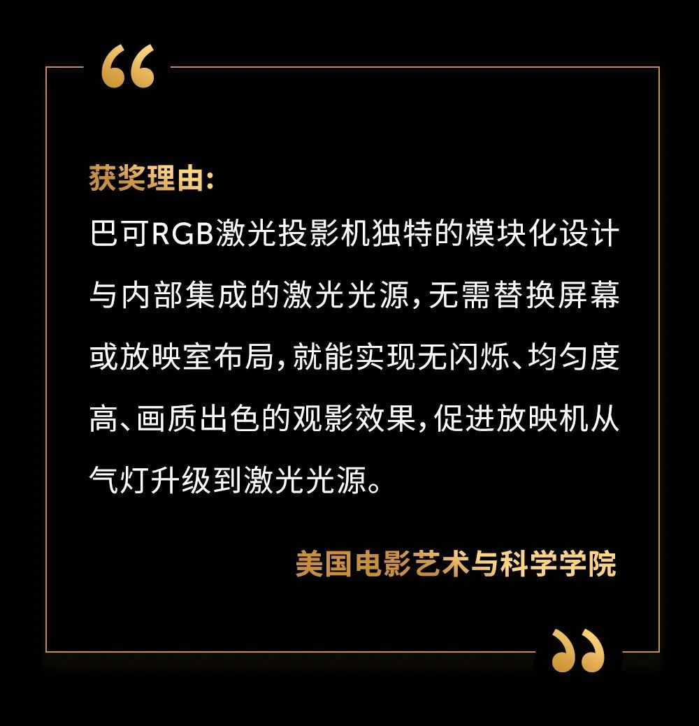 奥斯卡科学和技术奖旨在表彰那些通过创新对电影做出重大和长期贡献的个人及公司,由“技术成就奖”与“科学与工程奖”组成,今年有16项电影科技成就得到表彰,巴可RGB激光投影机正是其中之一。