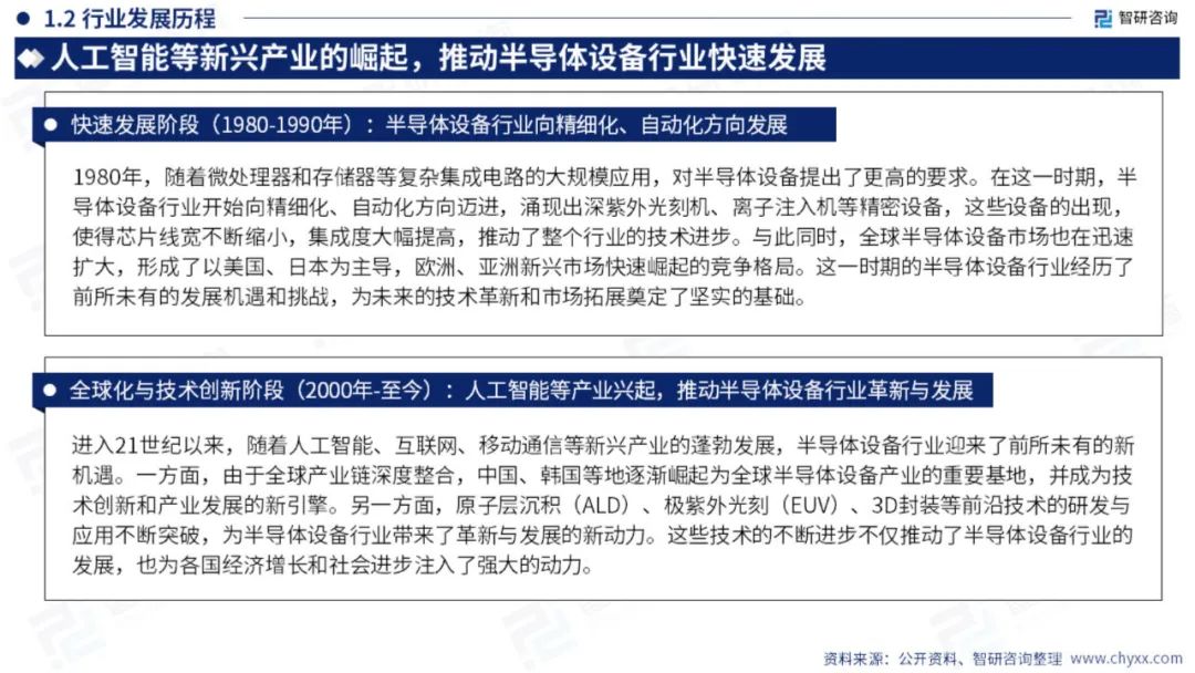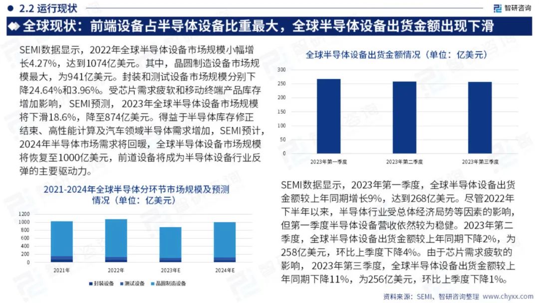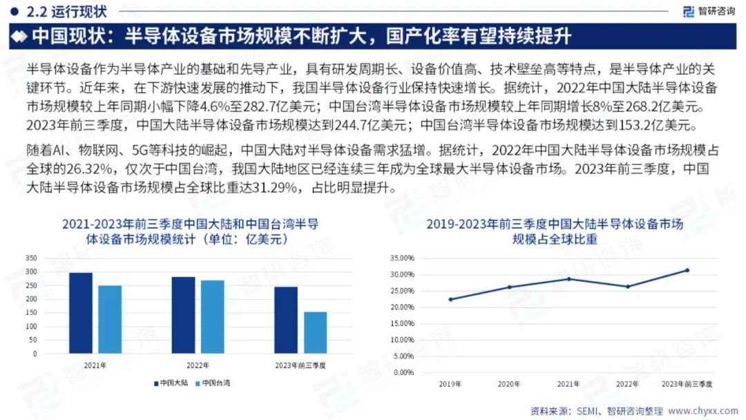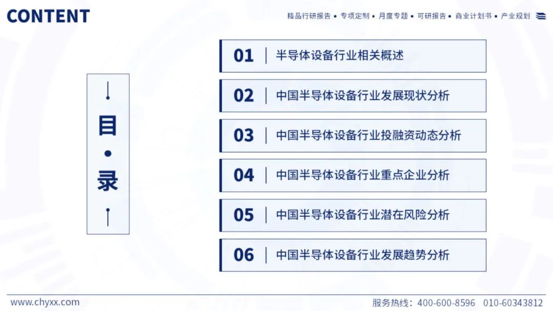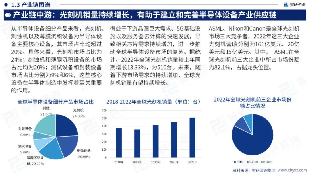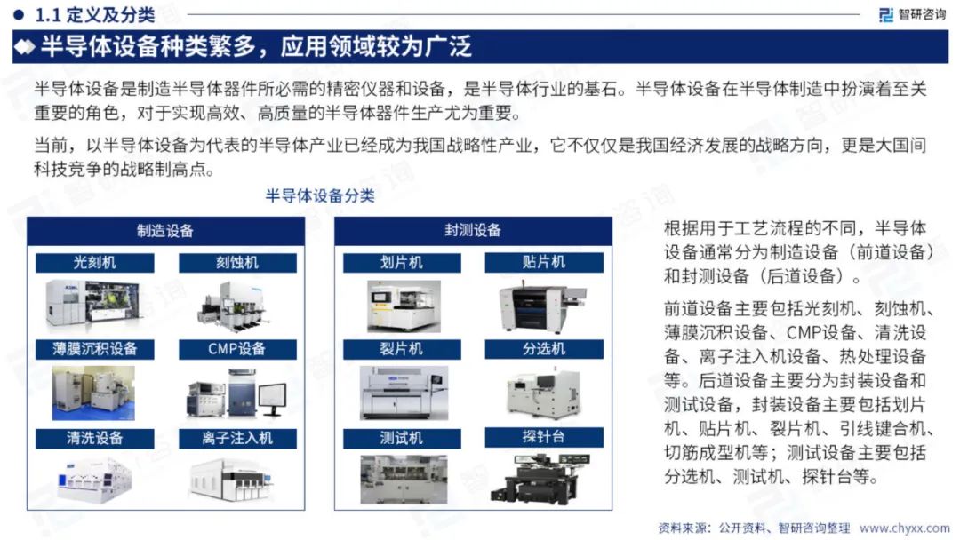 半导体设备泛指生产各类半导体产品所需要的设备,半导体设备可以分为IC制造设备和封测设备两大类。IC制造设备大致可以分为11大类,50多种机型,其核心有光刻机、刻蚀机、薄膜沉积机、离子注入机、CMP设备、清洗机、前道检测设备和氧化退火设备八大类。封测设备可以细分为分选机、划片机、贴片机、检测设备等。从市场规模上看,IC制造设备占整个设备市场规模的85%以上。