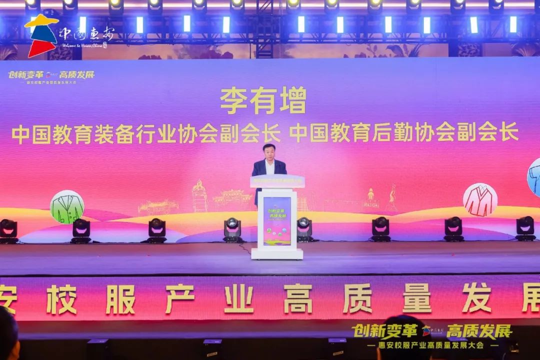 李有增代表中国教育装备行业协会、中国教育后勤协会,对本次大会的召开表示热烈的祝贺,并祝愿惠安校服产业在惠安县委、县政府的领导下,立足新起点、迈上新征程、开创新辉煌。李有增指出——