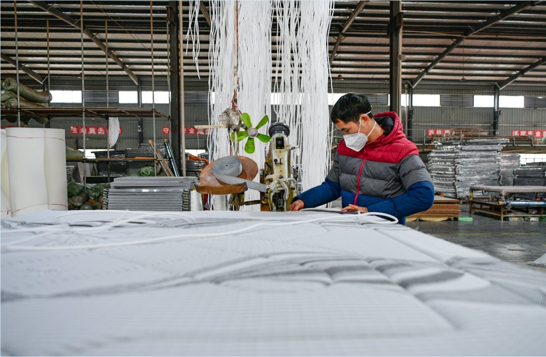 (棕丰公司的床垫生产车间内,工人们正在加紧生产。)