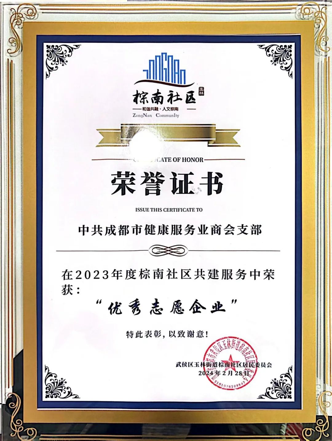 2月28日,武侯区玉林街道棕南社区开展“树典型·表先进”表彰大会,对10个先进模范企业单位进行表彰,中共成都市健康服务业商会支部在2023年度棕南社区共建服务中荣获“优秀志愿企业”荣誉称号。