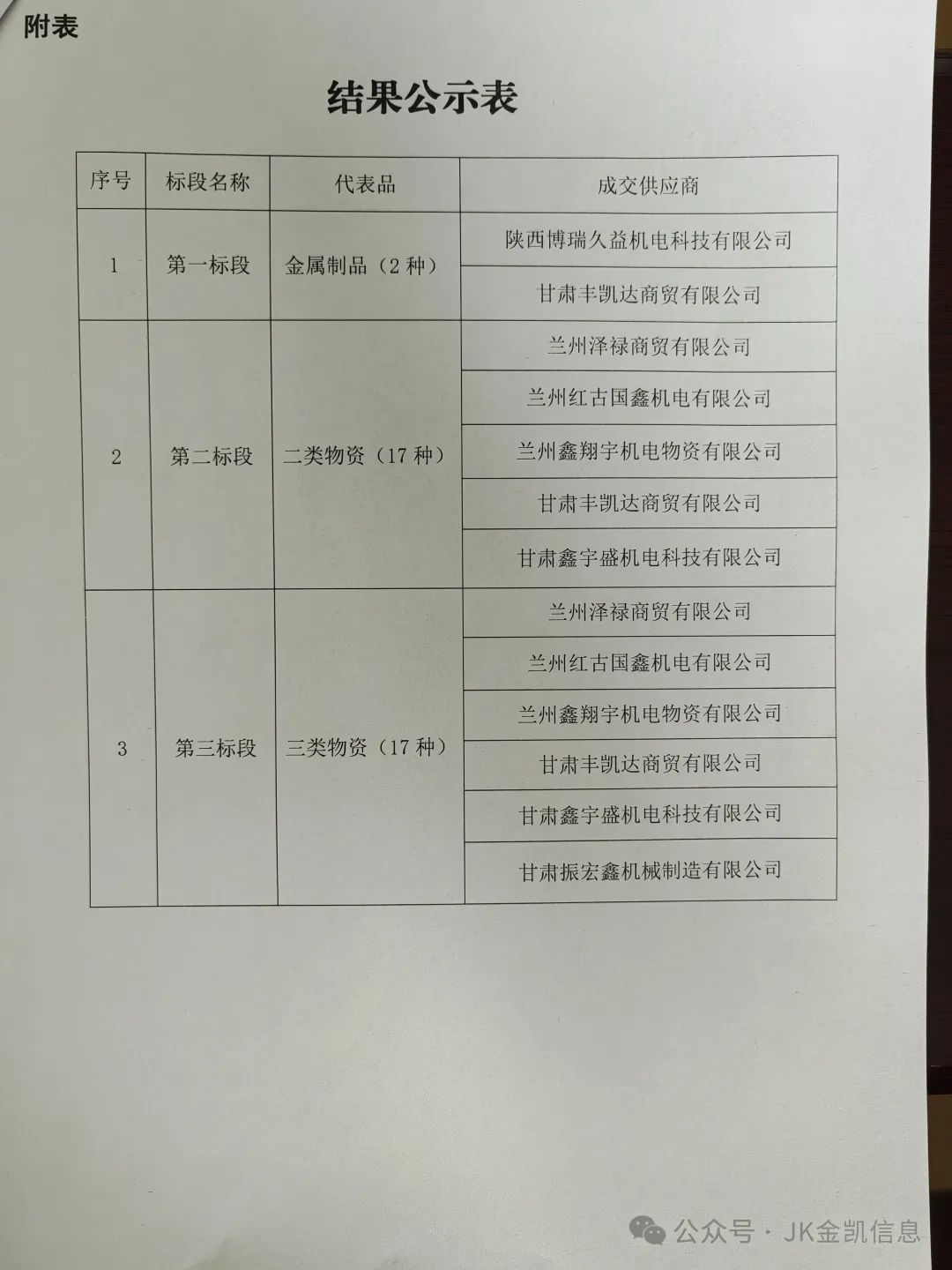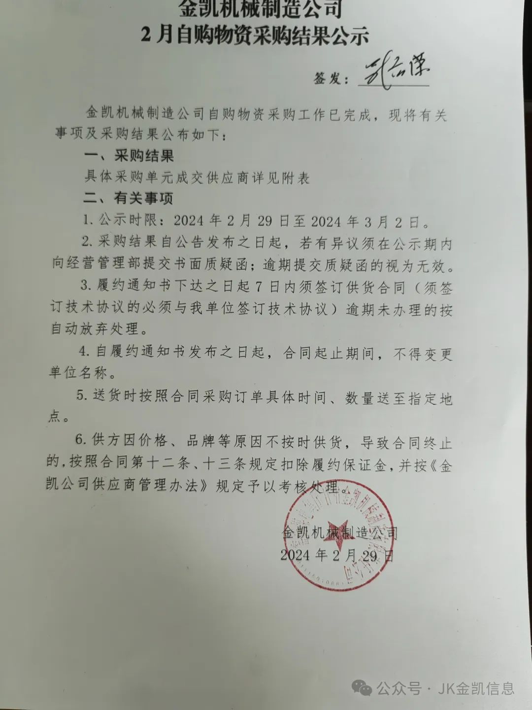金凯机械制造公司自购物资采购工作已完成,现将有关事项及采购结果公布如下: