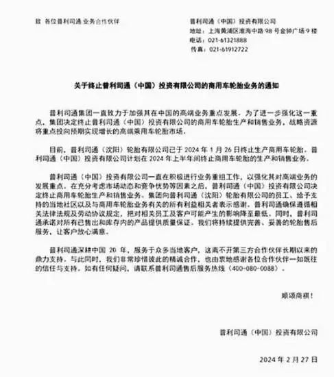 通知表示,目前,普利司通(沈阳)轮胎有限公司已于2024年1月26日终止生产商用车轮胎,普利司通(中国)投资有限公司计划在2024年上半年间终止商用车轮胎的生产和销售业务。普利司通还表示,将遵循相关法律法规及劳动协议规定,把对相关员工及客户可能产生的影响降至最低,同时,普利通承诺对所有已售出和库存内的产品提供质量保证,将持续提供完善、妥善的轮胎售后服务。