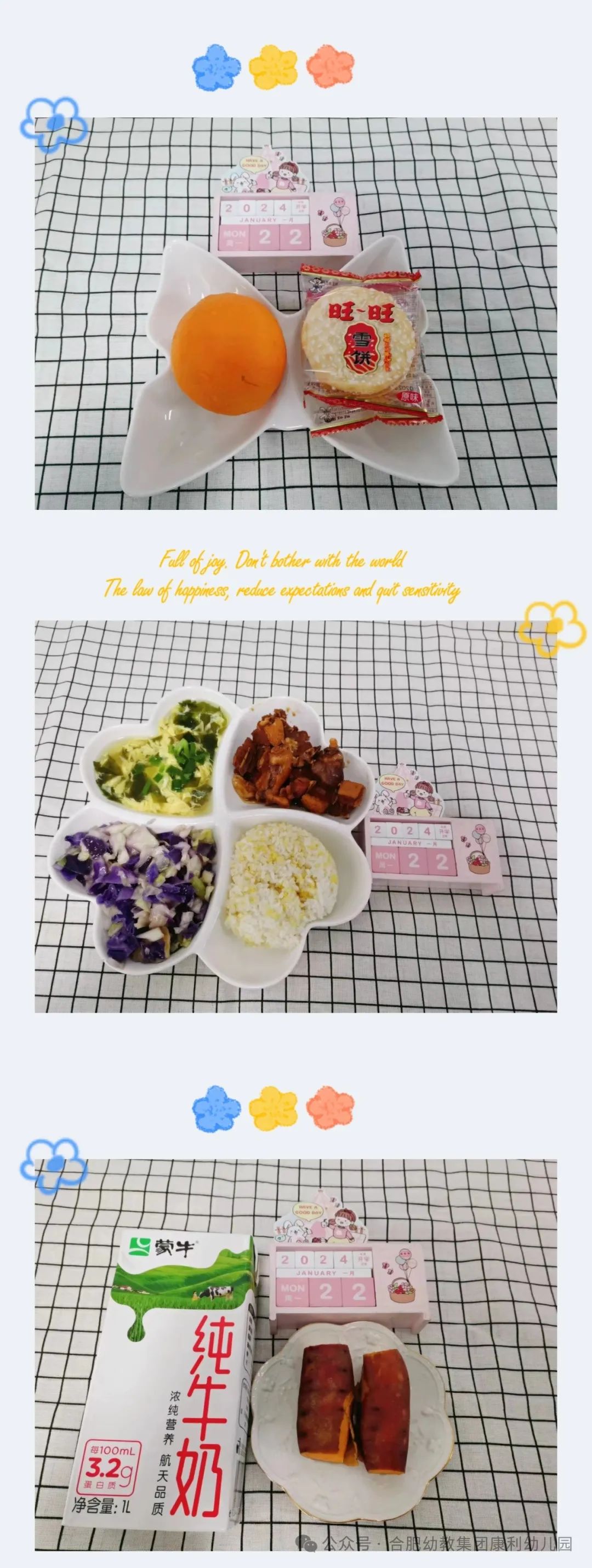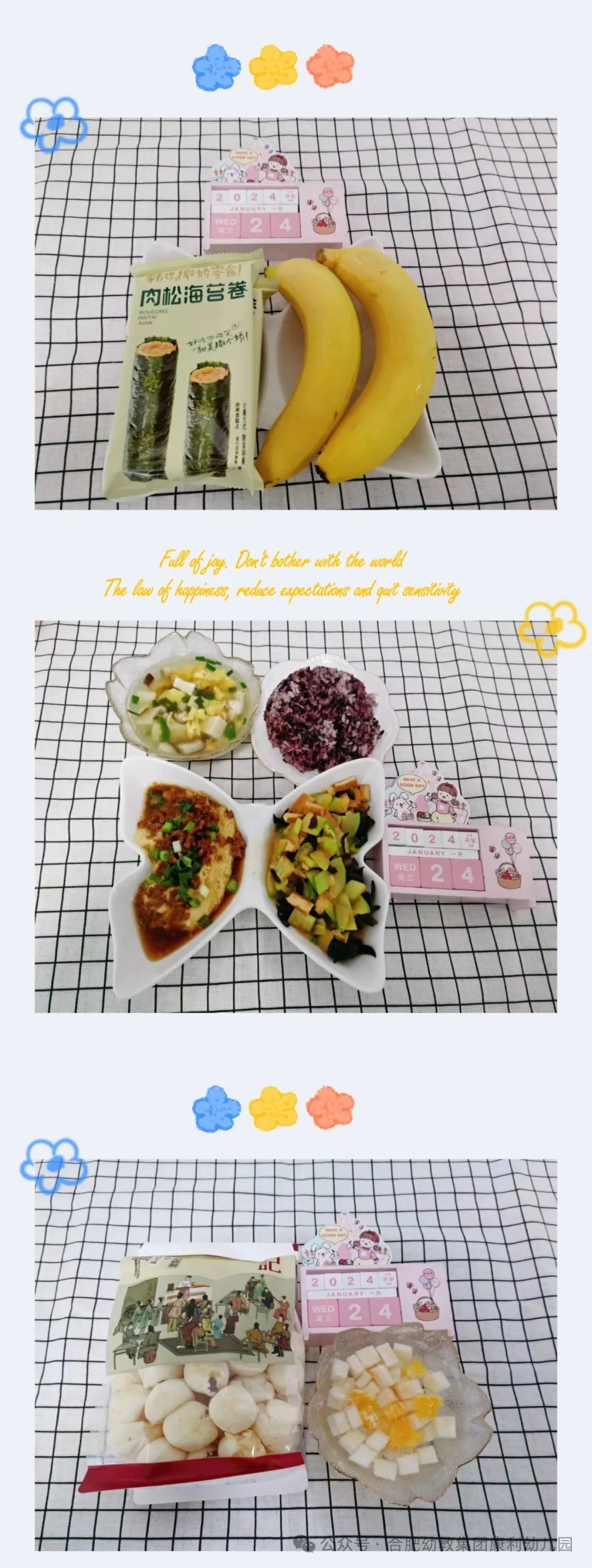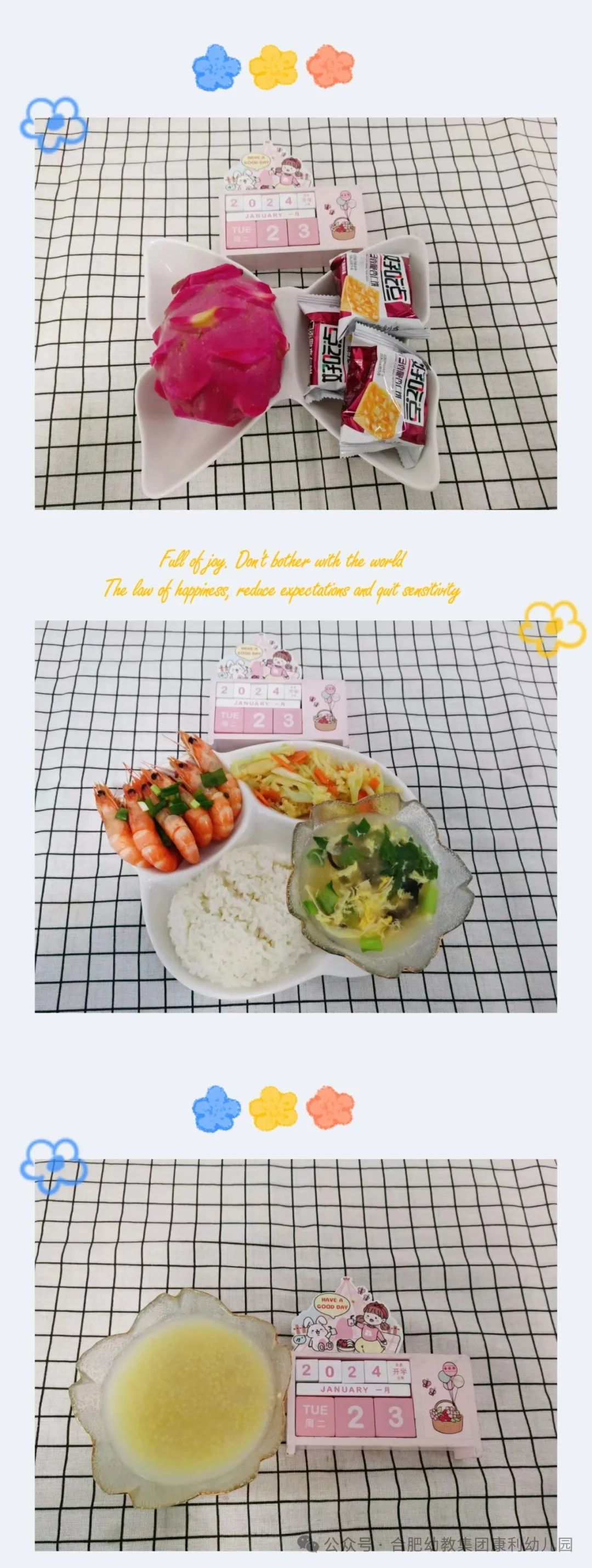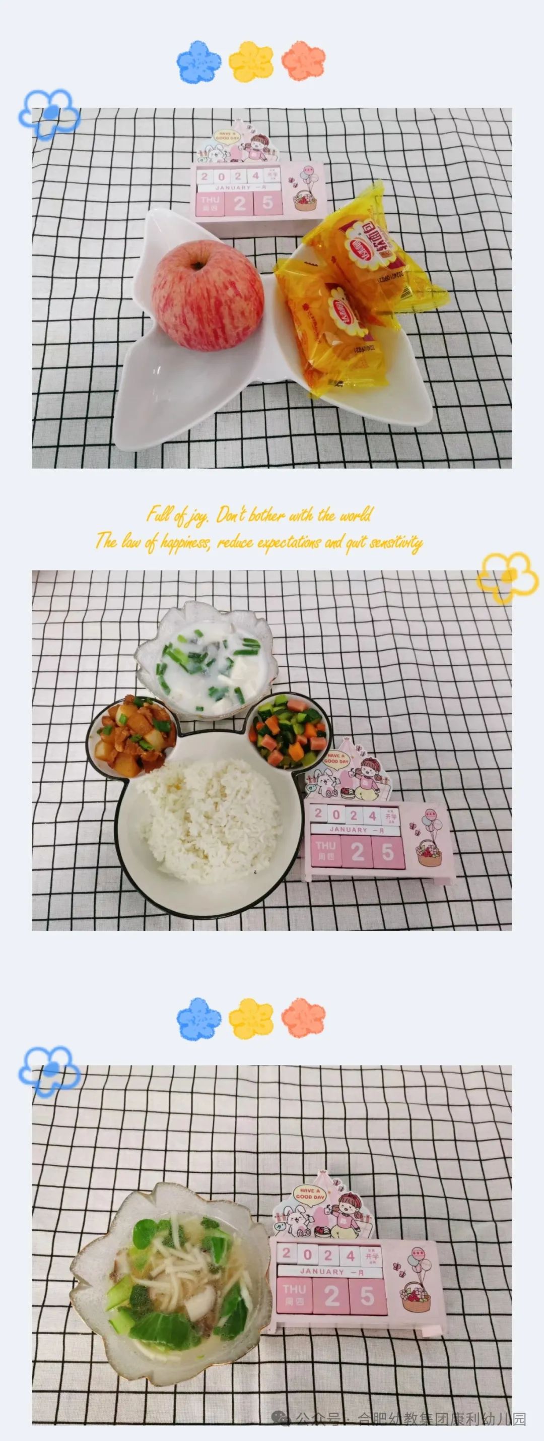 午餐:金银米饭、红烧鸭块、双色卷心菜(包菜、紫甘蓝)、裙带菜鸡蛋滑肉汤