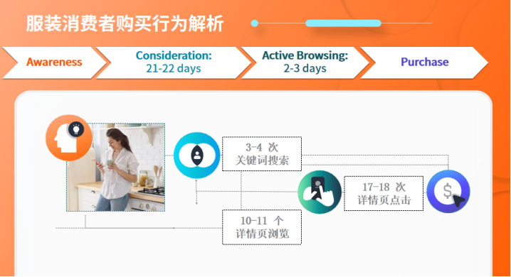 另外,我们发现,当消费者开始搜索服装产品时,平均会使用3~4个关键词进行搜索,此后才会点击进入详情页获取更多信息,并且在这一环节中,每个消费者平均会点击17~18次不同的详情页,其中大约有10~11个详情页会被他们仔细浏览。