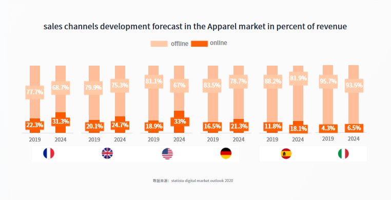 从区域市场表现看,欧美市场仍是全球服装消费的主力市场,线上销售表现强劲,女装线上销售占比逐步扩大,预计到2024年,美国、法国、英国、德国的服装电商收入占比将位列前四。