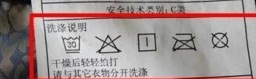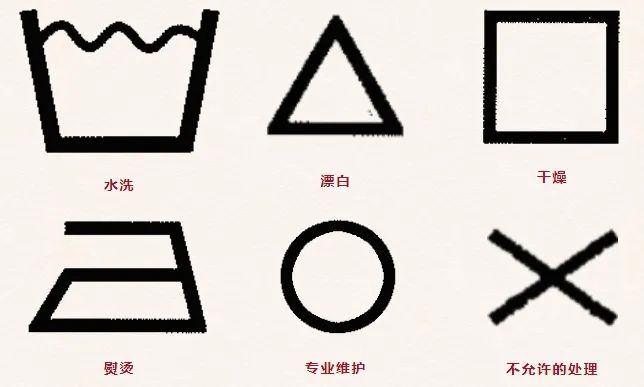 标签上印制的符号顺序应为:水洗、漂白、干燥、熨烫、专业维护。