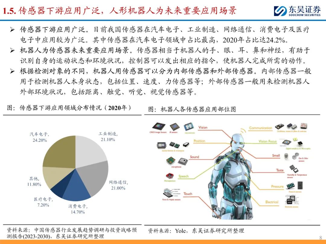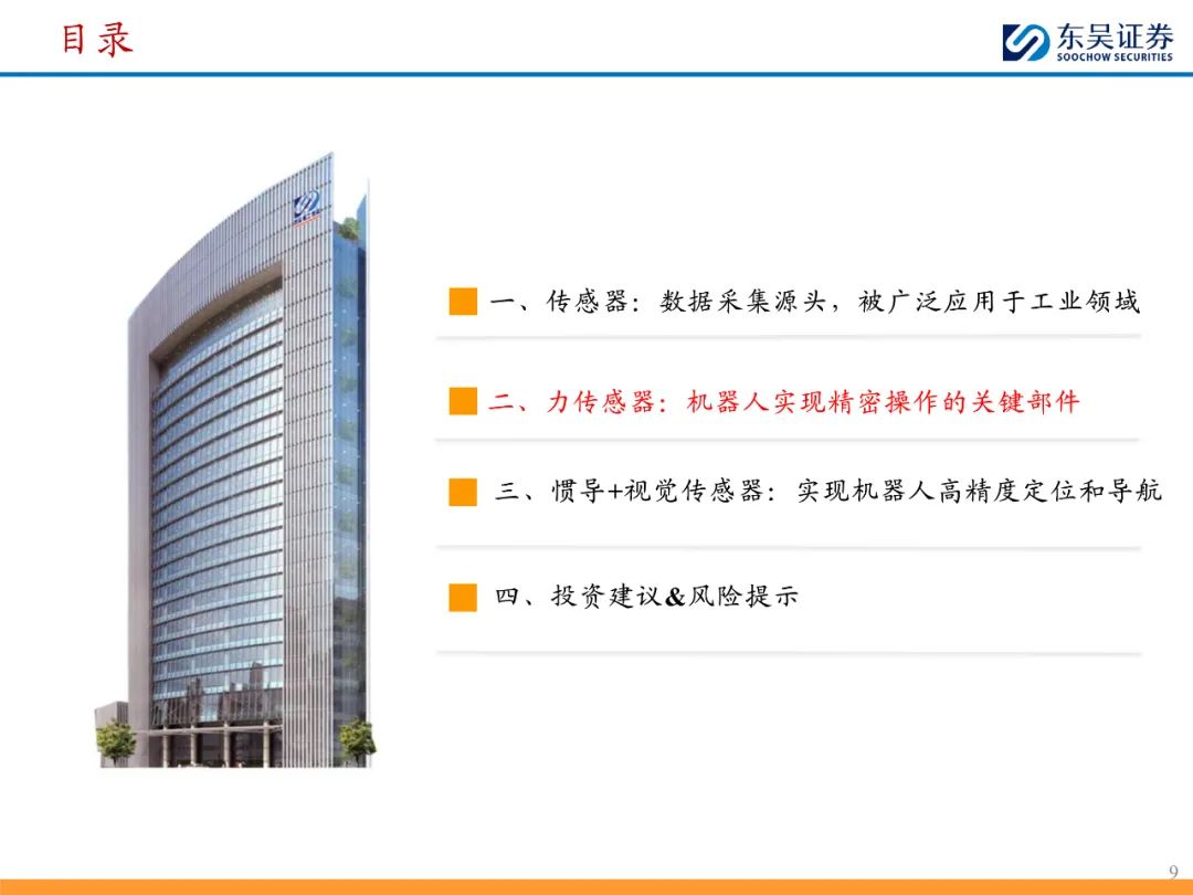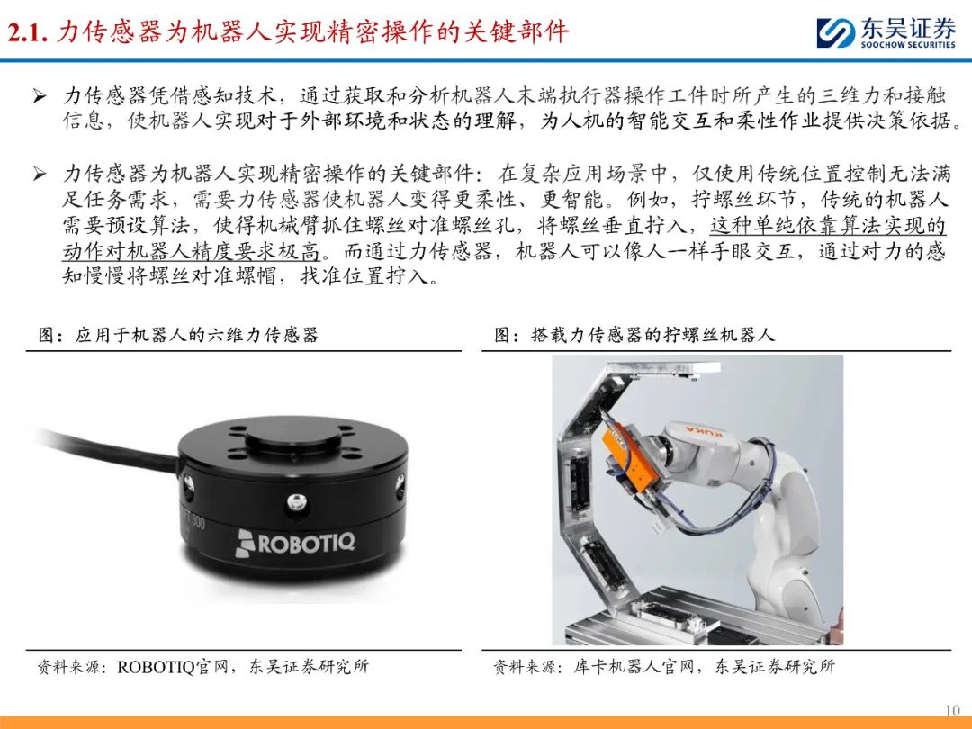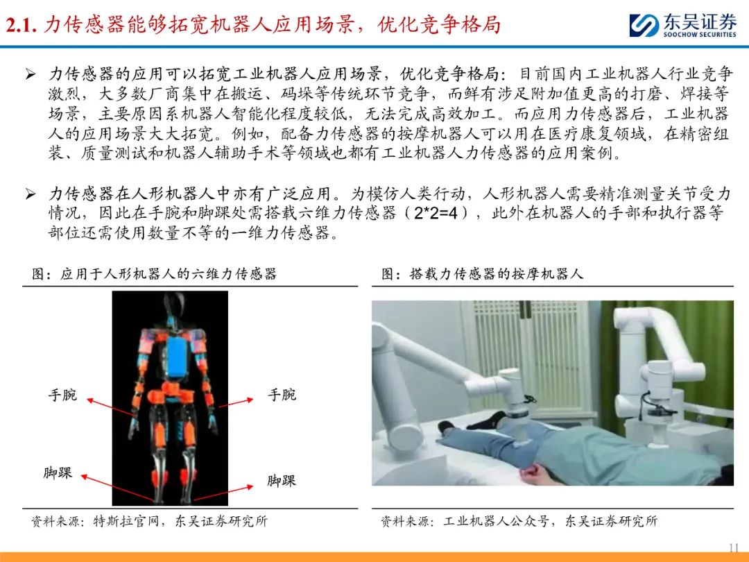力传感器能够帮助机器人实现打磨、焊接等精密操作,拓宽机器人应用场景,优化国产厂商于搬运、码垛等传统环节的激烈竞争格局。此外力传感器在人形机器人中亦有广泛应用,为模仿人类,人形机器人需精准测量关节受力情况,因此在手腕和脚踝处需搭载六维力传感器。